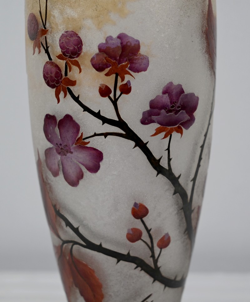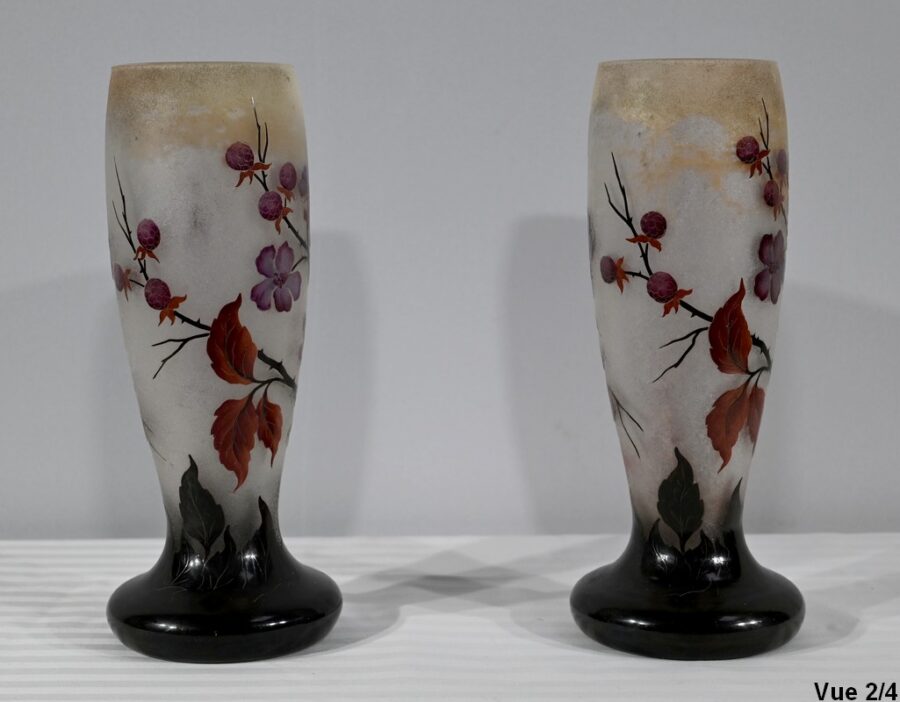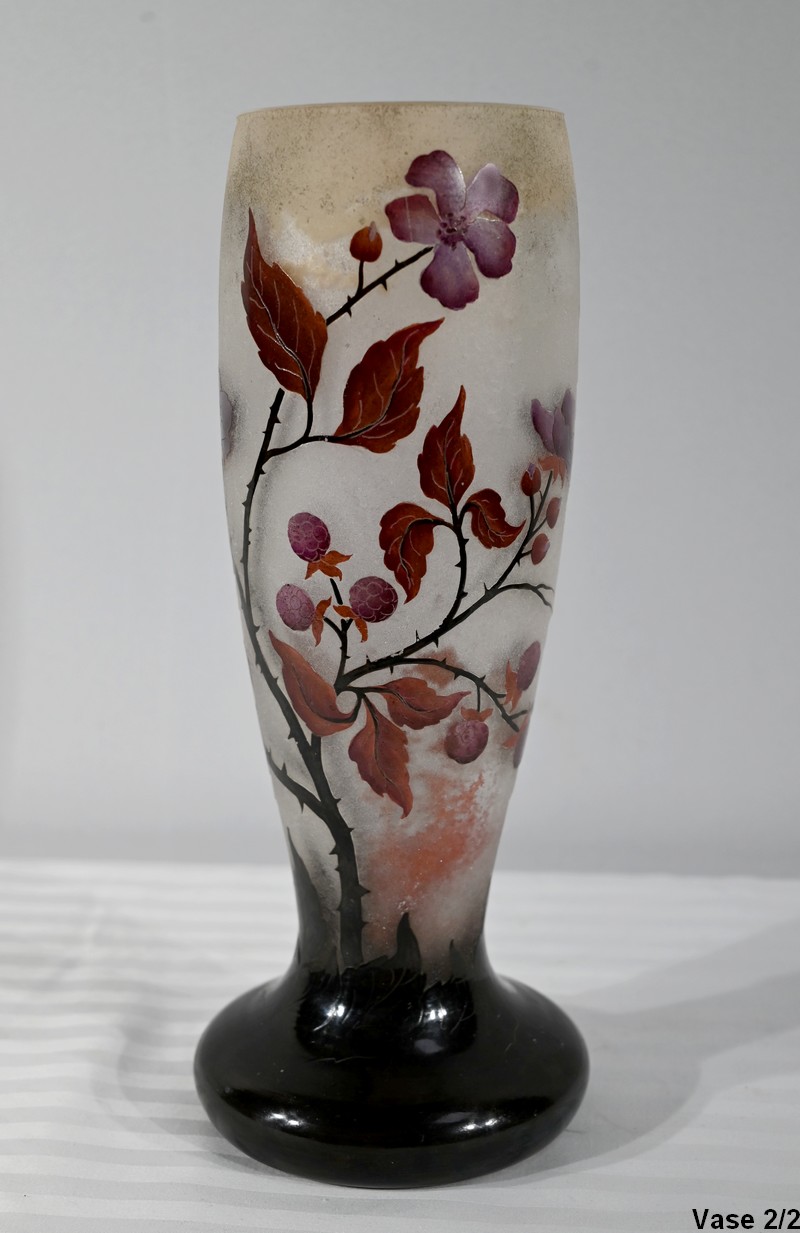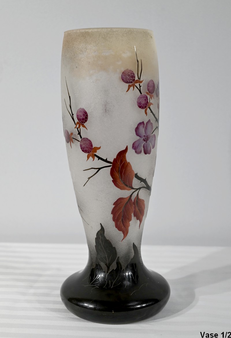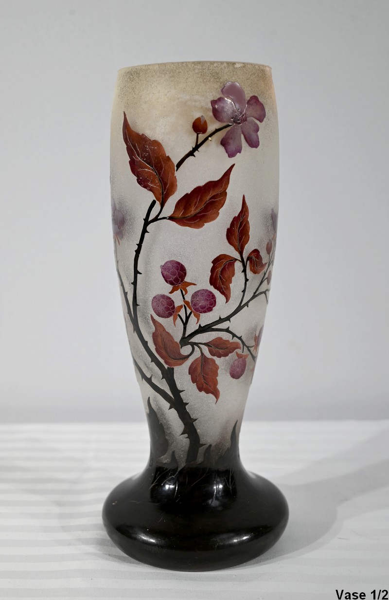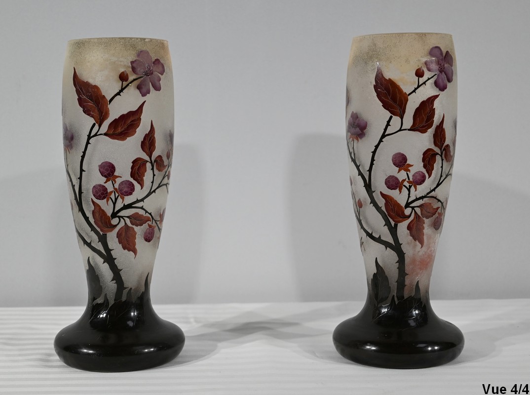 Ces vases présentent des décors identiques, dégagés à l’acide, de baies et de ronces fleuries dans des couleurs marron et violet sur fond gris. Les bases sont bulbées et ornées de feuilles noires émaillées.
