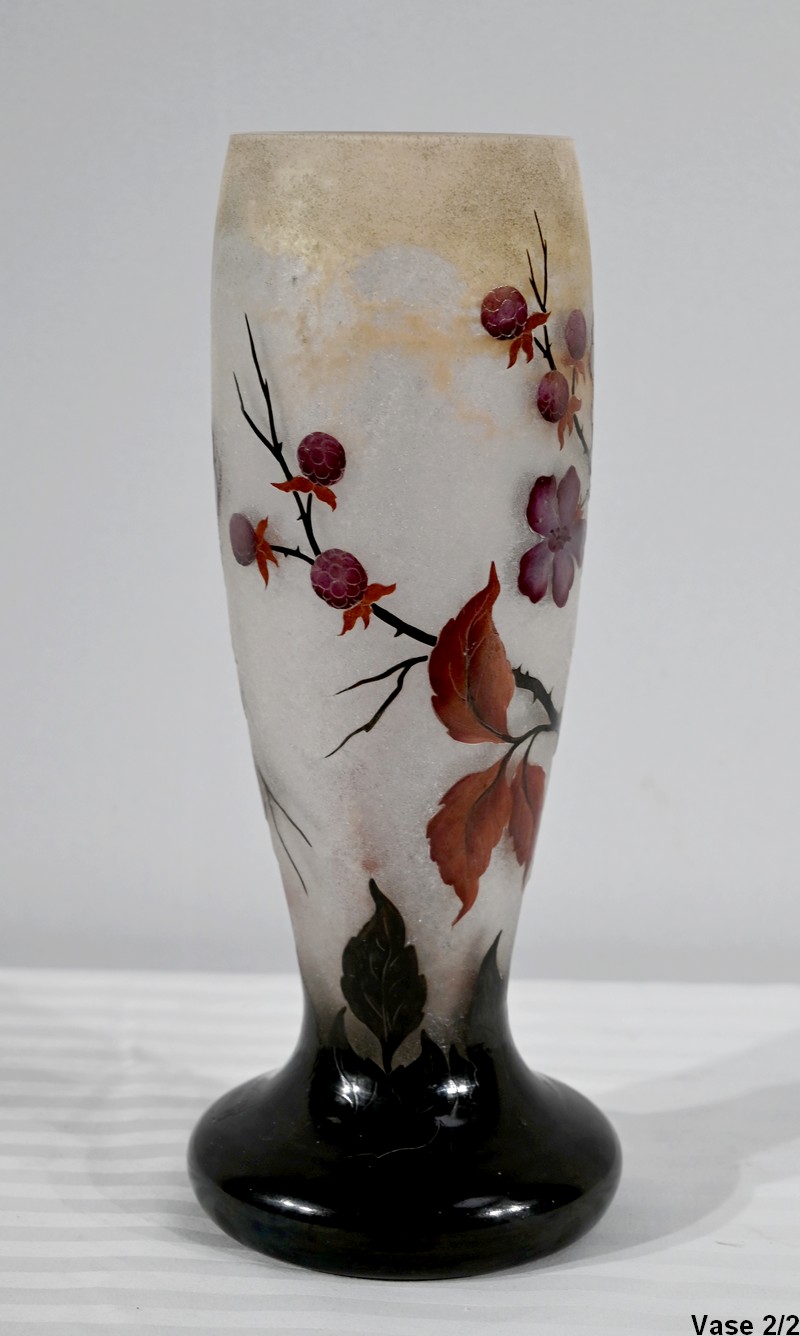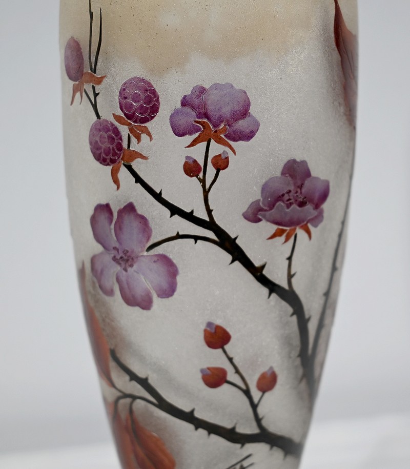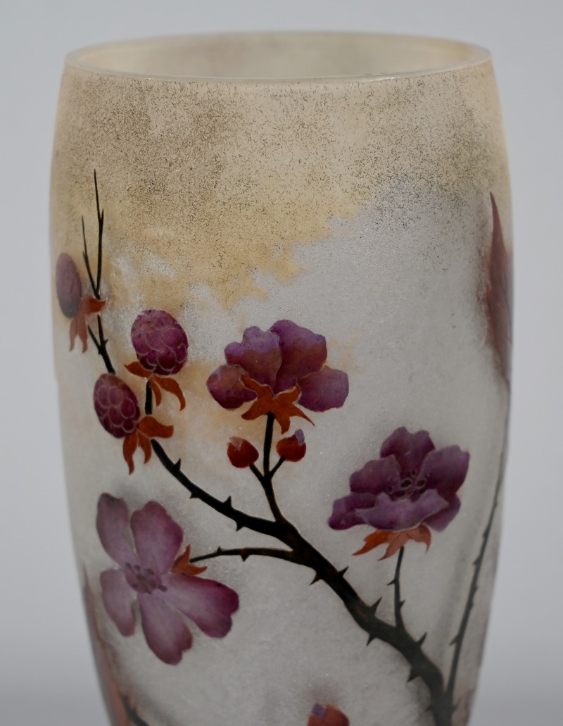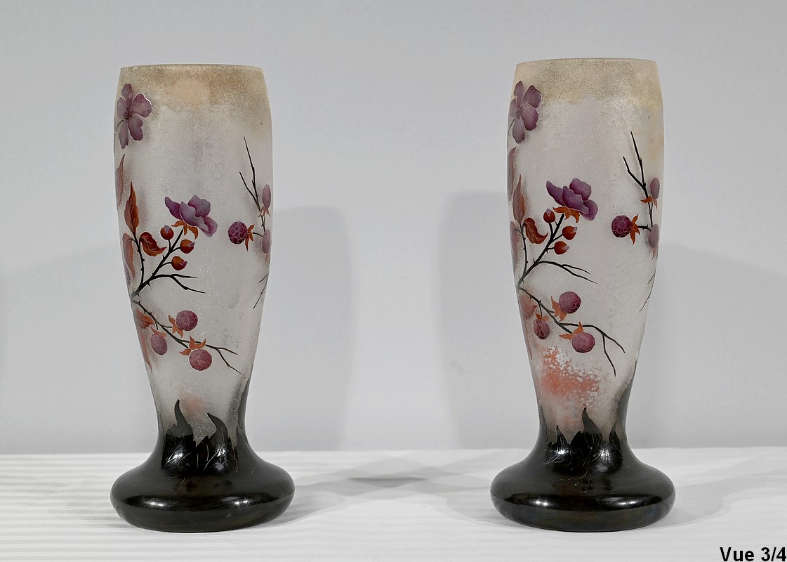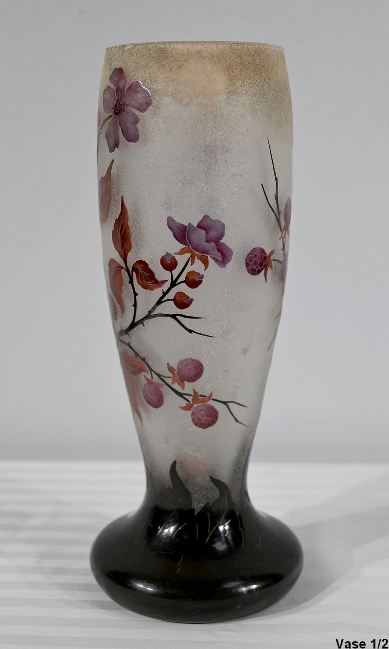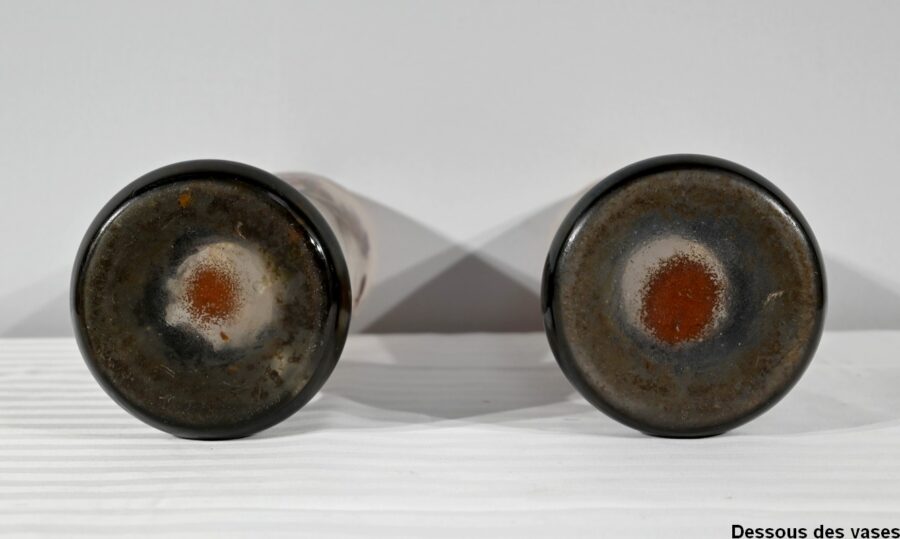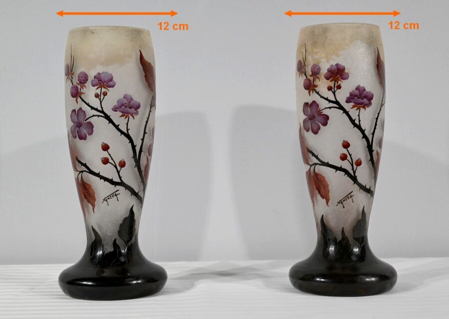 Ces vases présentent des décors identiques, dégagés à l’acide, de baies et de ronces fleuries dans des couleurs marron et violet sur fond gris. Les bases sont bulbées et ornées de feuilles noires émaillées.