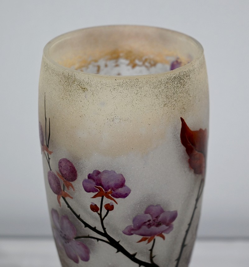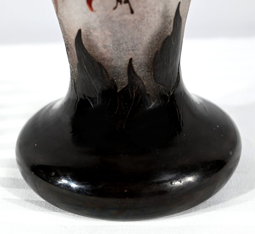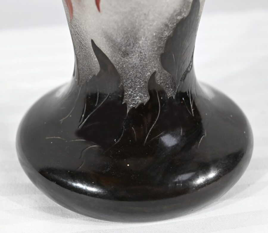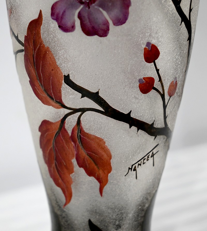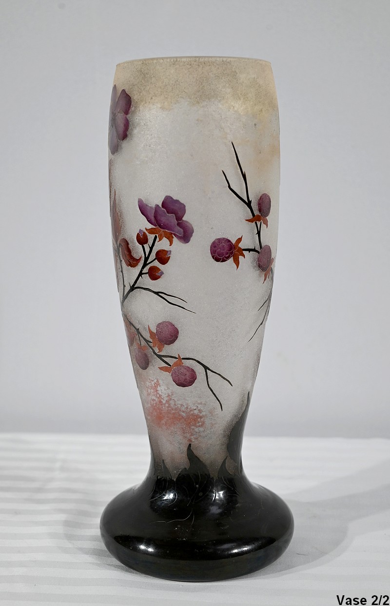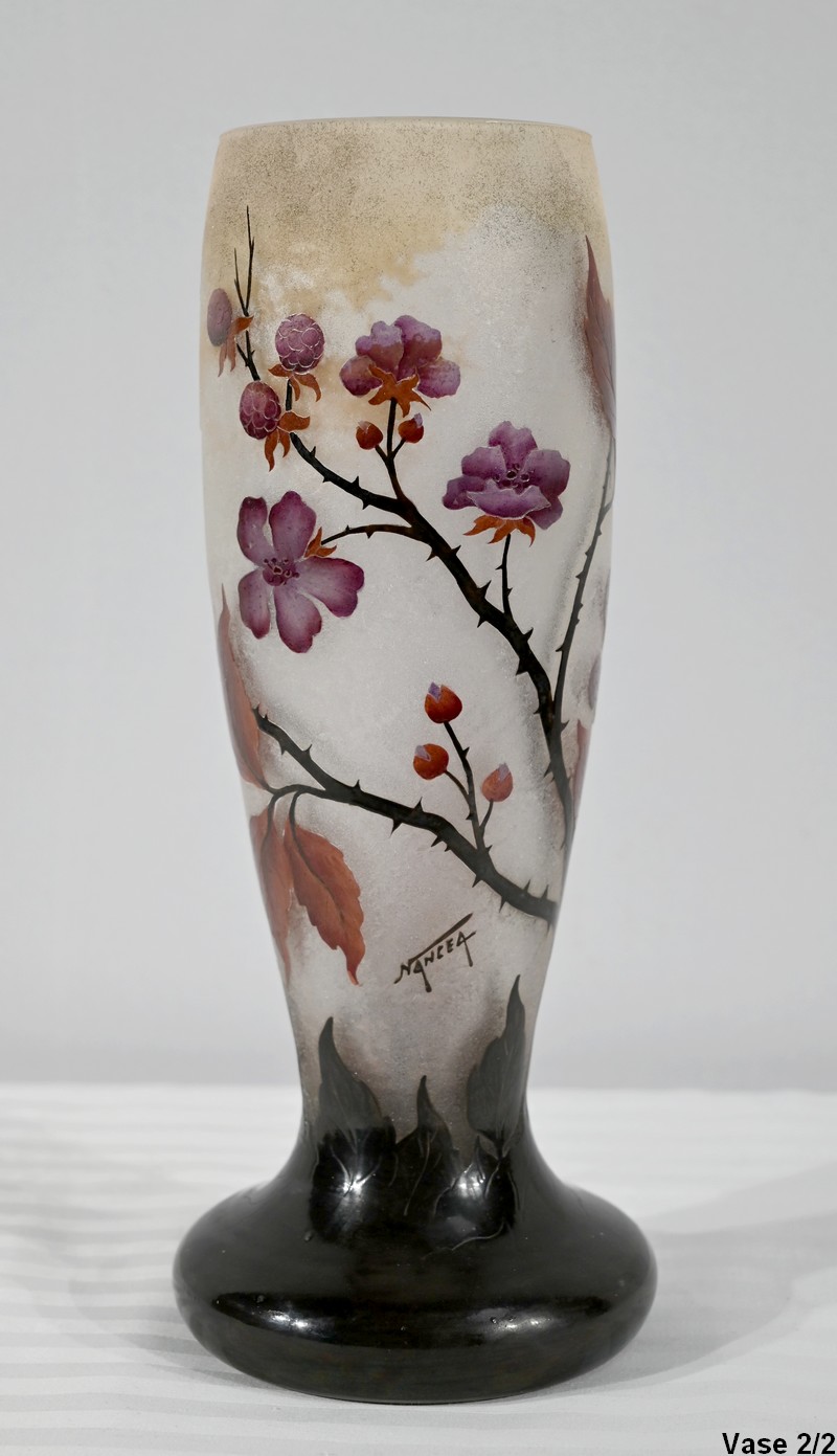 Ces vases présentent des décors identiques, dégagés à l’acide, de baies et de ronces fleuries dans des couleurs marron et violet sur fond gris. Les bases sont bulbées et ornées de feuilles noires émaillées.