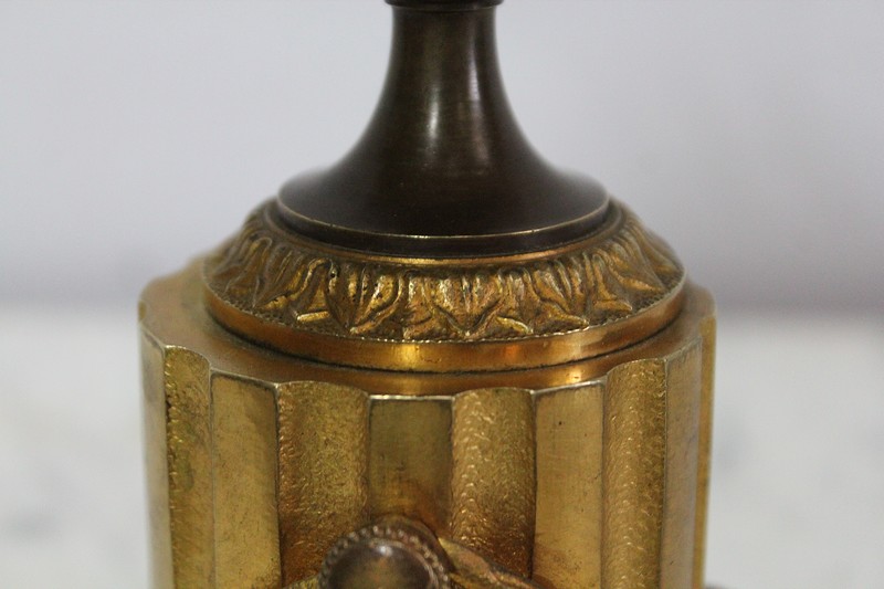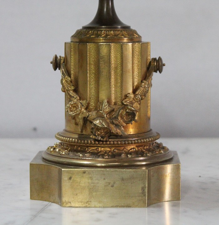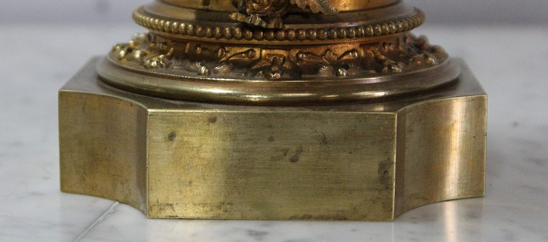 Elle repose sur un Fût Circulaire en Bronze à cannelures portant deux Guirlandes de Fleurs. Ce Fût est lui-même disposé sur un Socle de Base Carrée aux Angles Concaves.