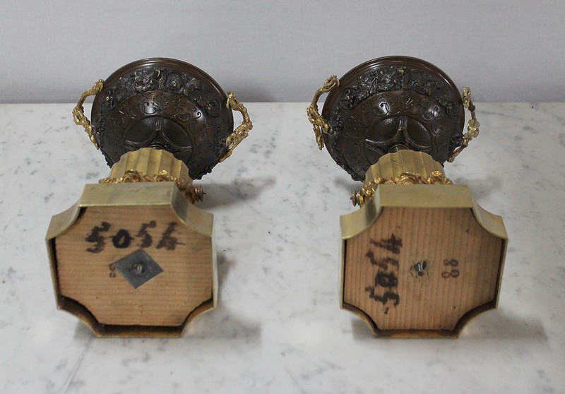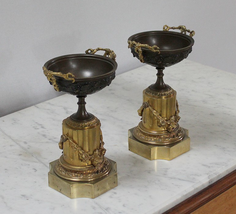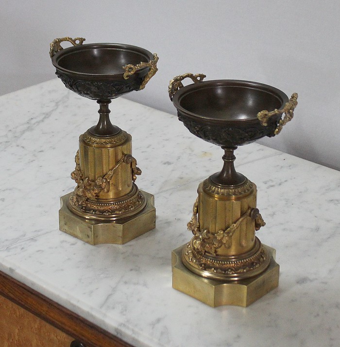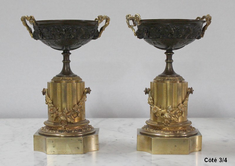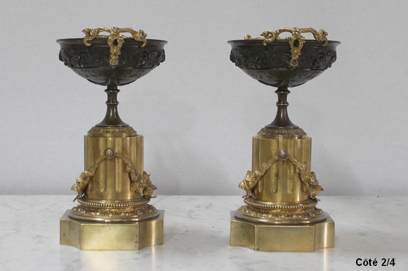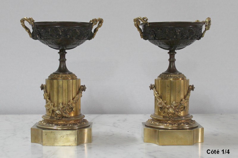 Cette Paire de Vide-poches présente en partie supérieure une Coupe en Bronze à Patine Brune sur piédouche. Elle est ornementée de Feuillages et est équipée de deux Anses en Bronze Doré.