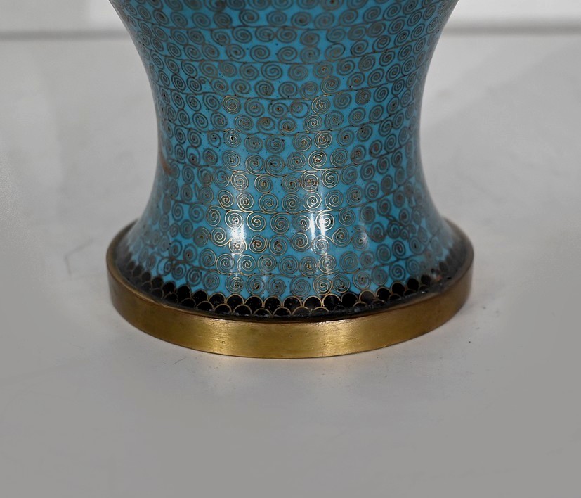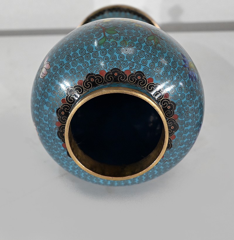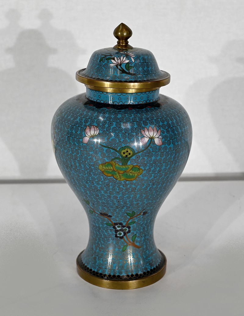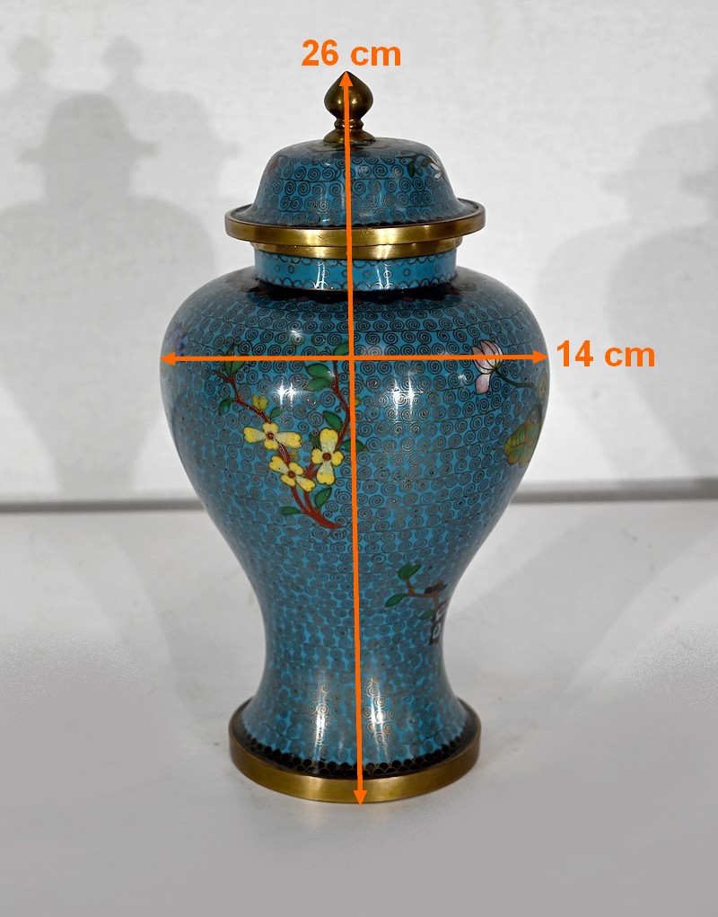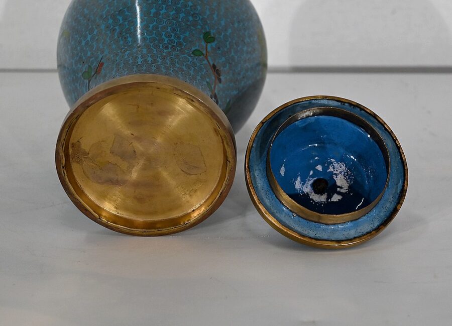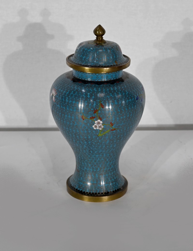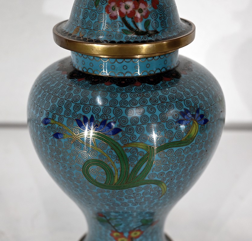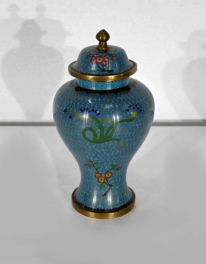 Potiche japonaise réalisée sous l’ère Meiji, en émaux cloisonnés sur fond bleu décoré d’une multitude de petites spirales dorées.