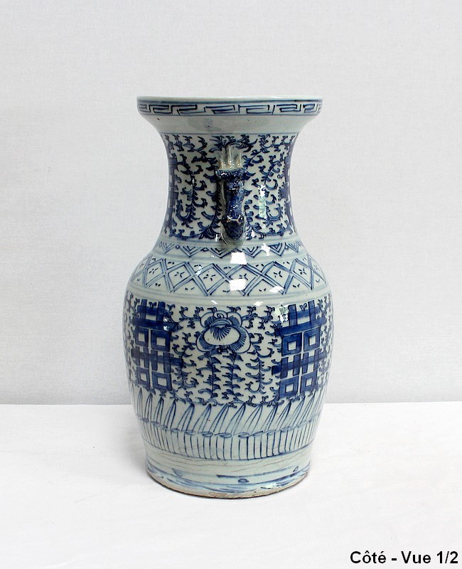 Vase en Porcelaine de Chine, de forme balustre à décor gris clair et bleu, mettant en scène des croisillons accompagnés de feuillages.