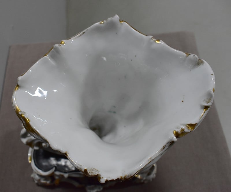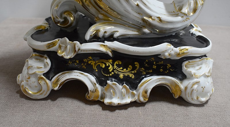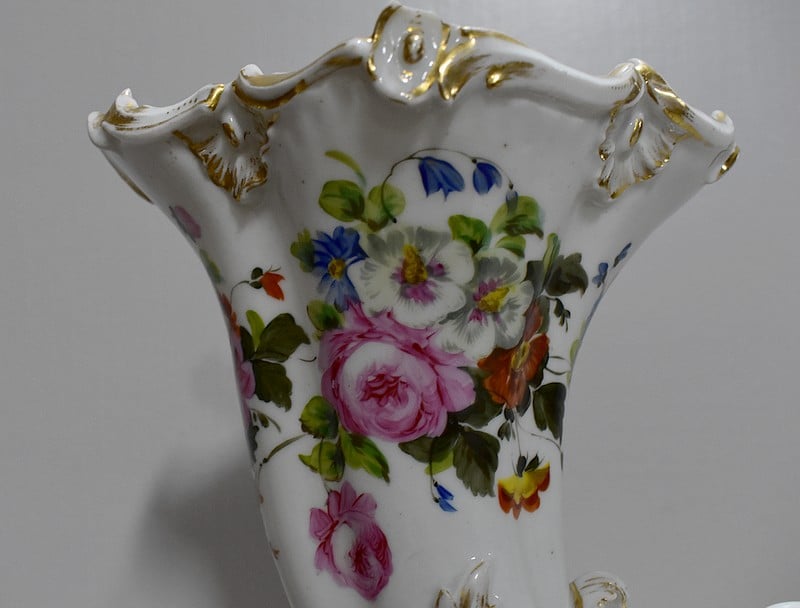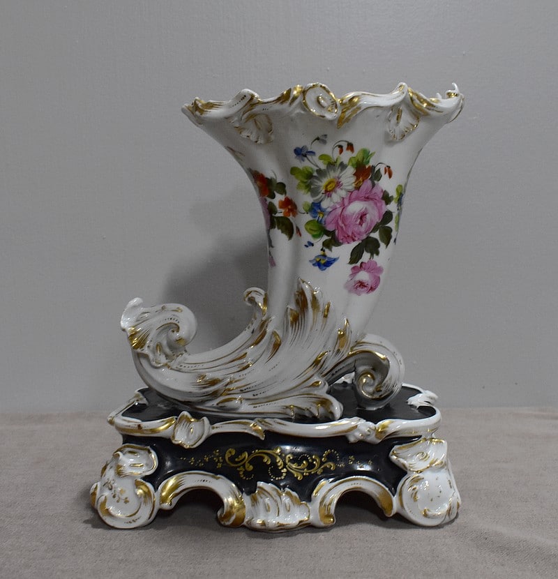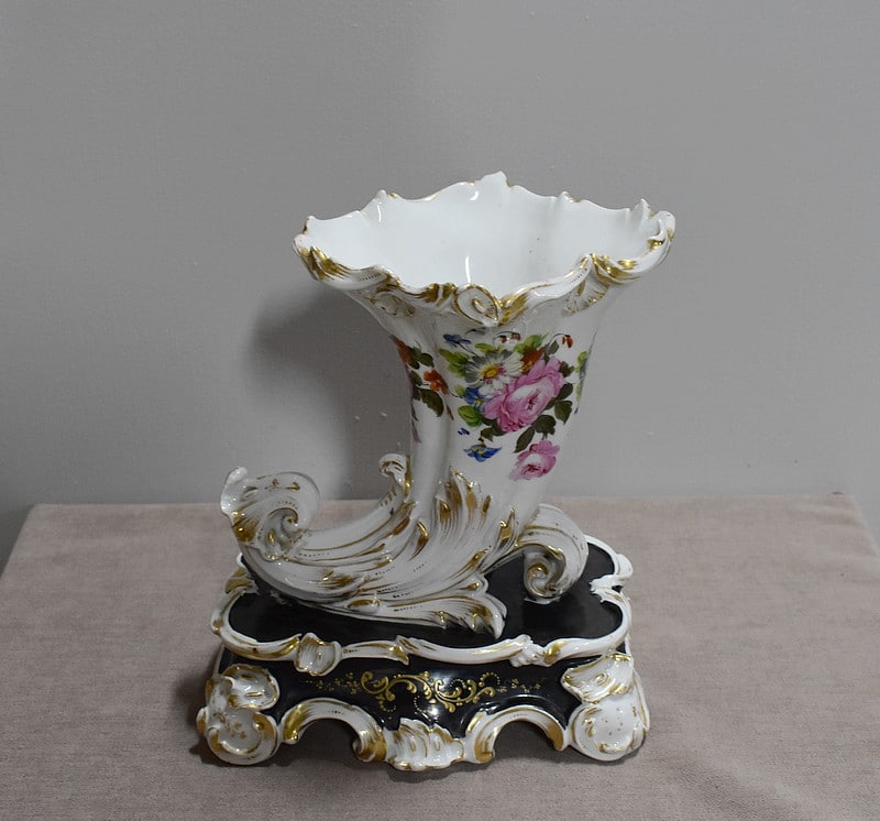 Vase cornet en porcelaine blanche à décor polychrome de fleurs, posé sur un socle rectangulaire noir et blanc orné de dorures.