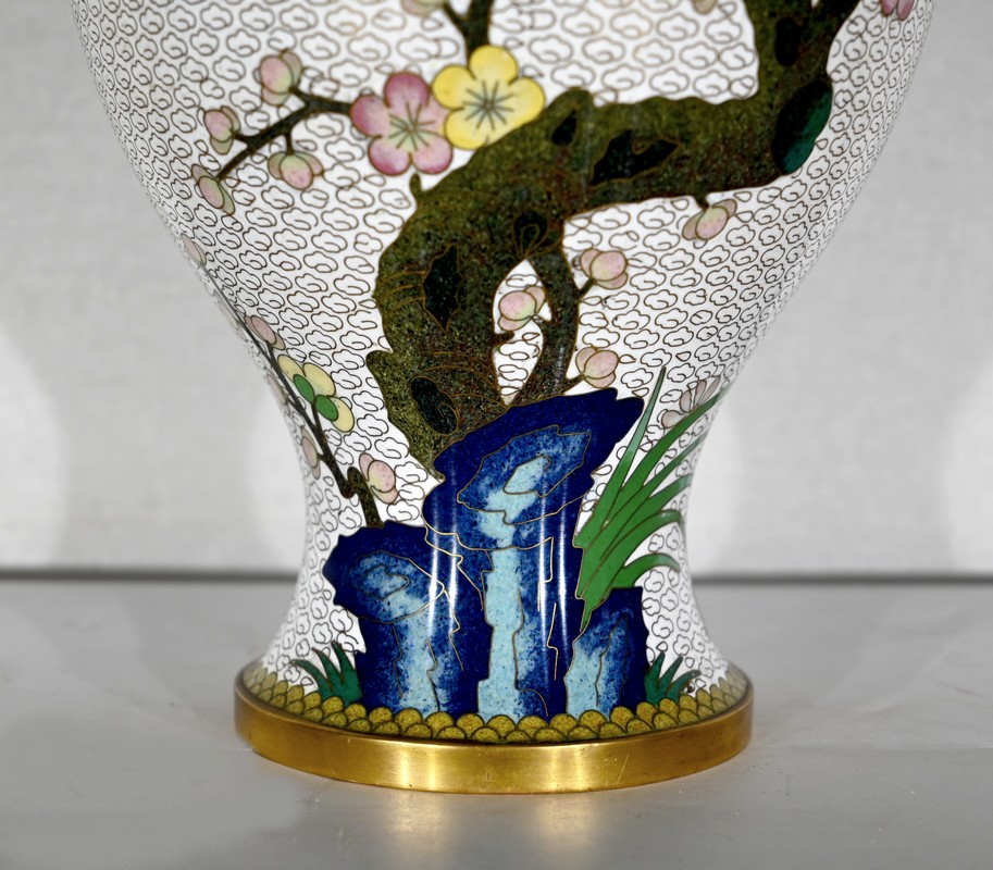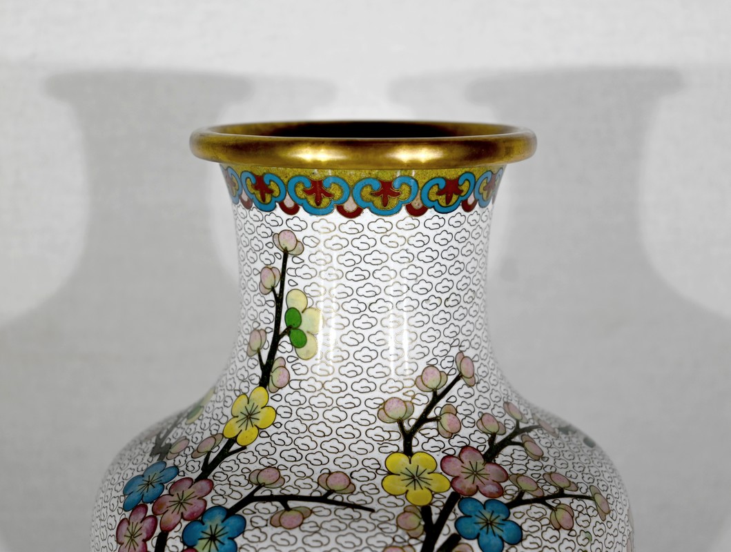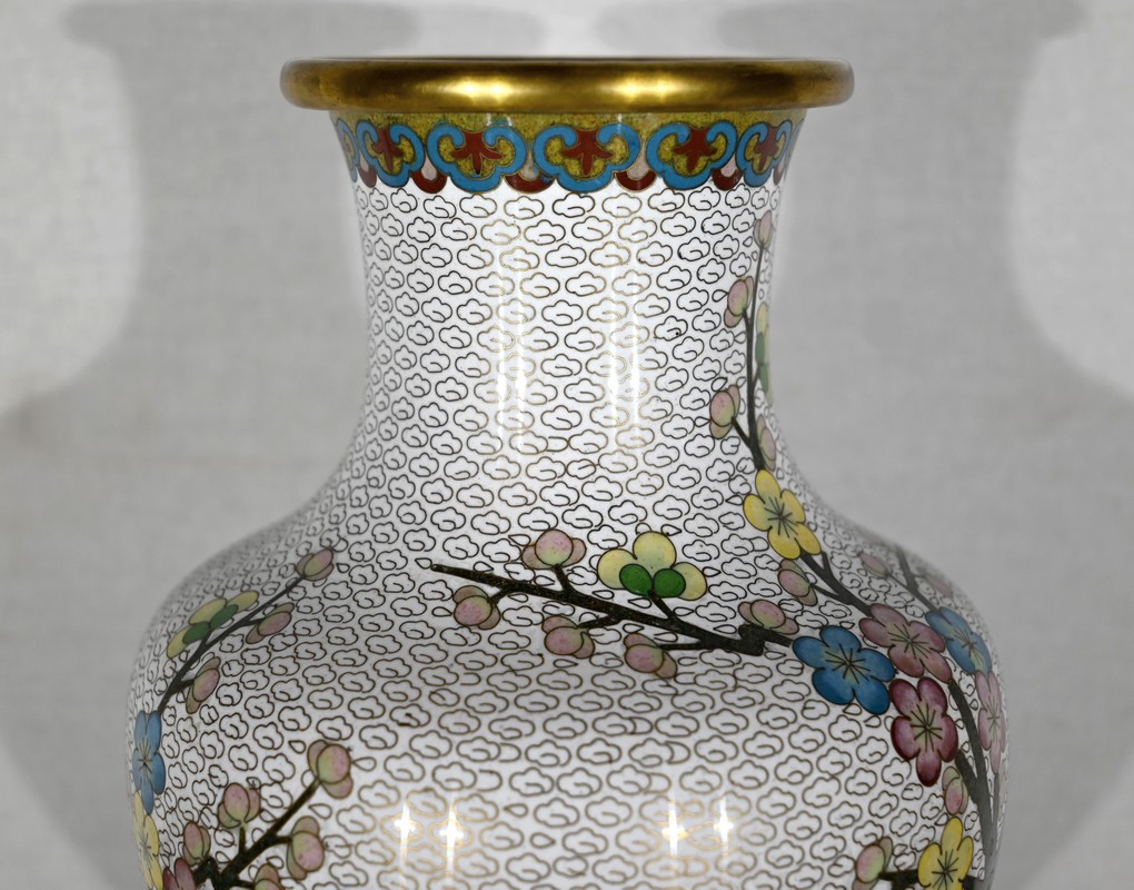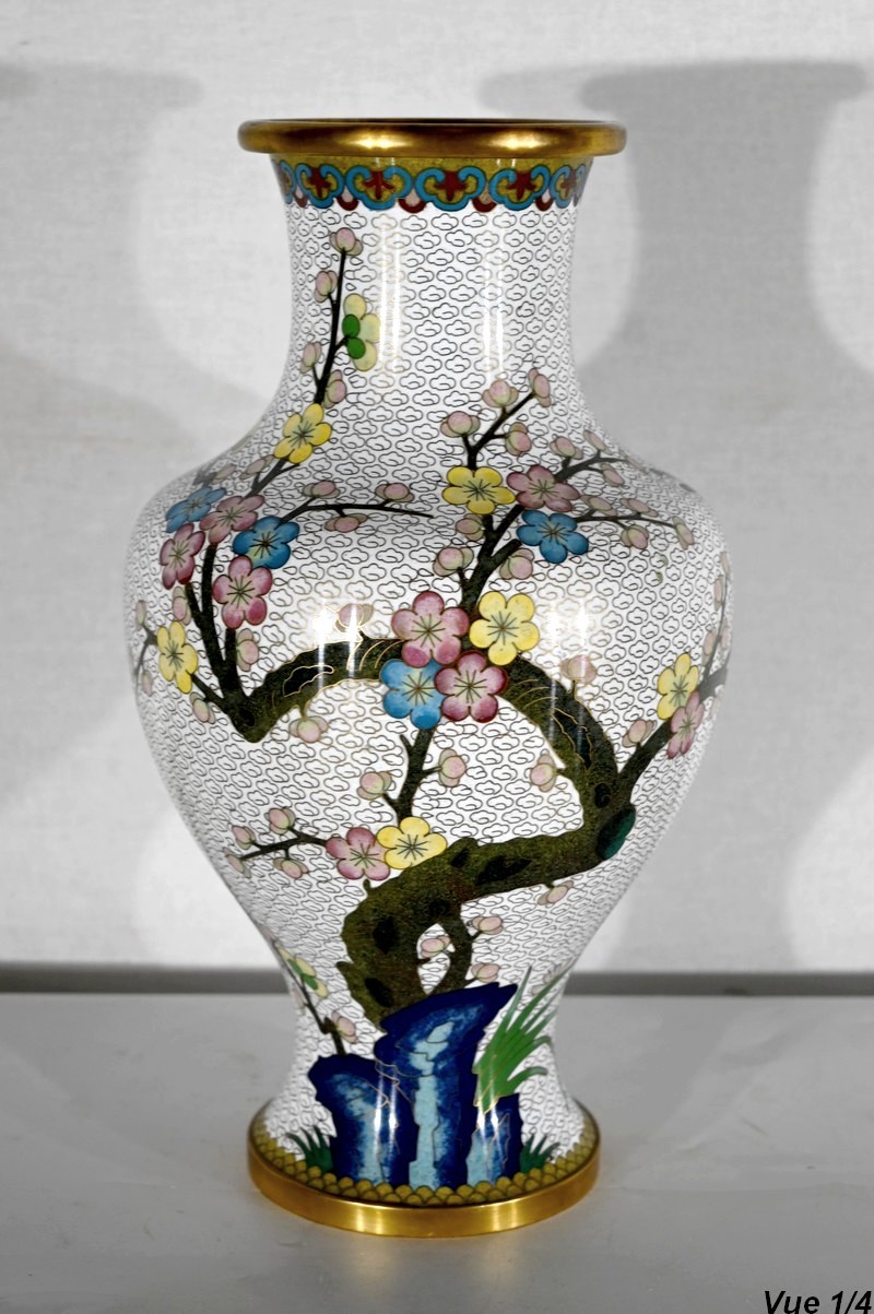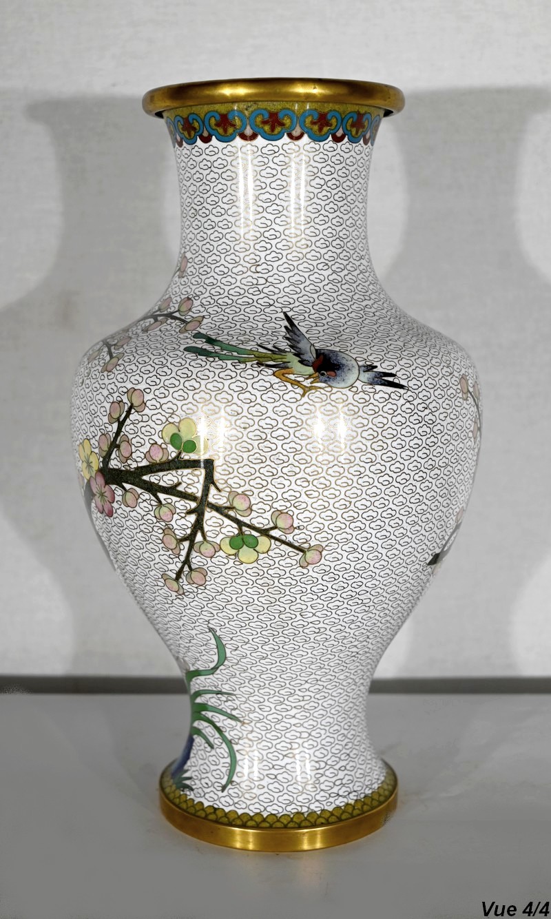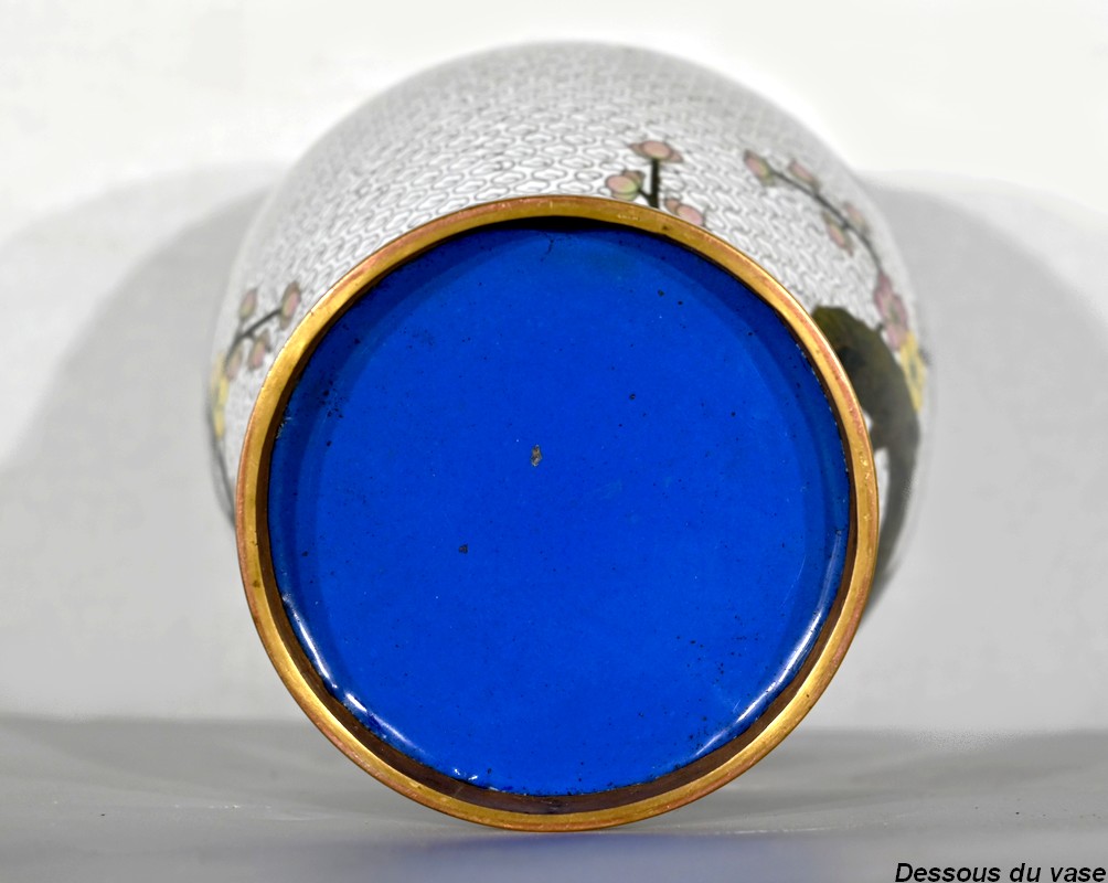 Vase en émail cloisonnée, à panse ovoïde pointée vers le bas, et au bord rétréci.