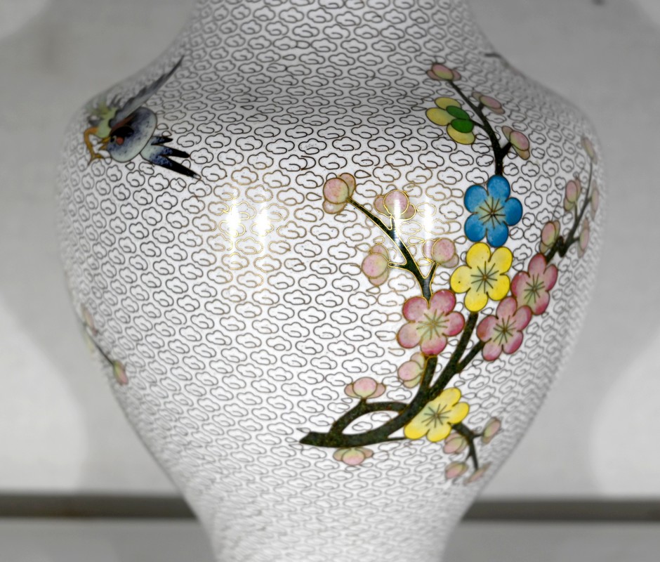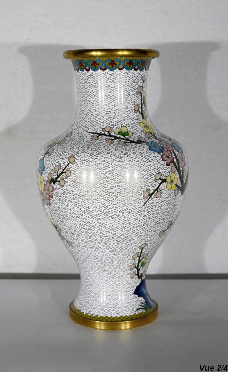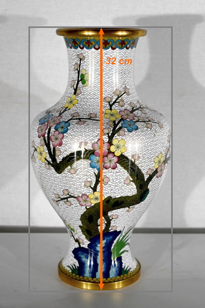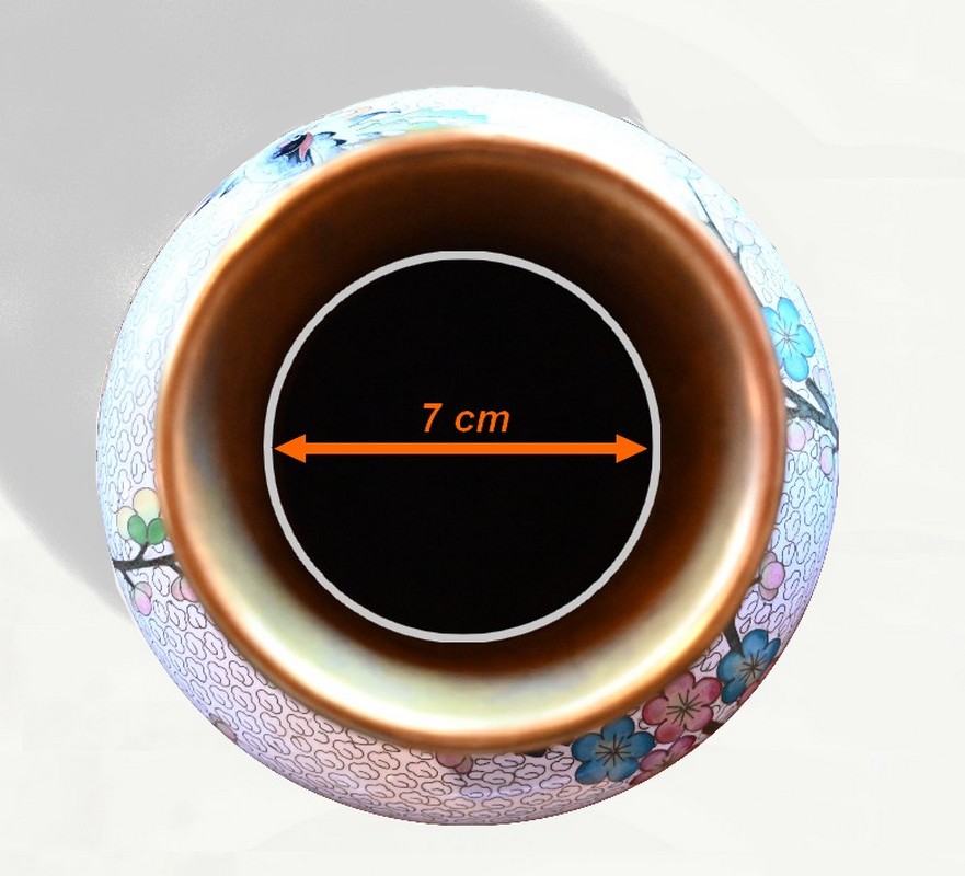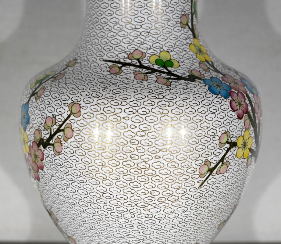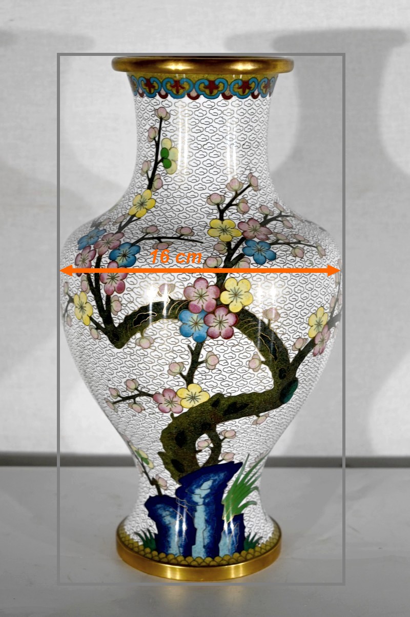 Vase en émail cloisonnée, à panse ovoïde pointée vers le bas, et au bord rétréci.