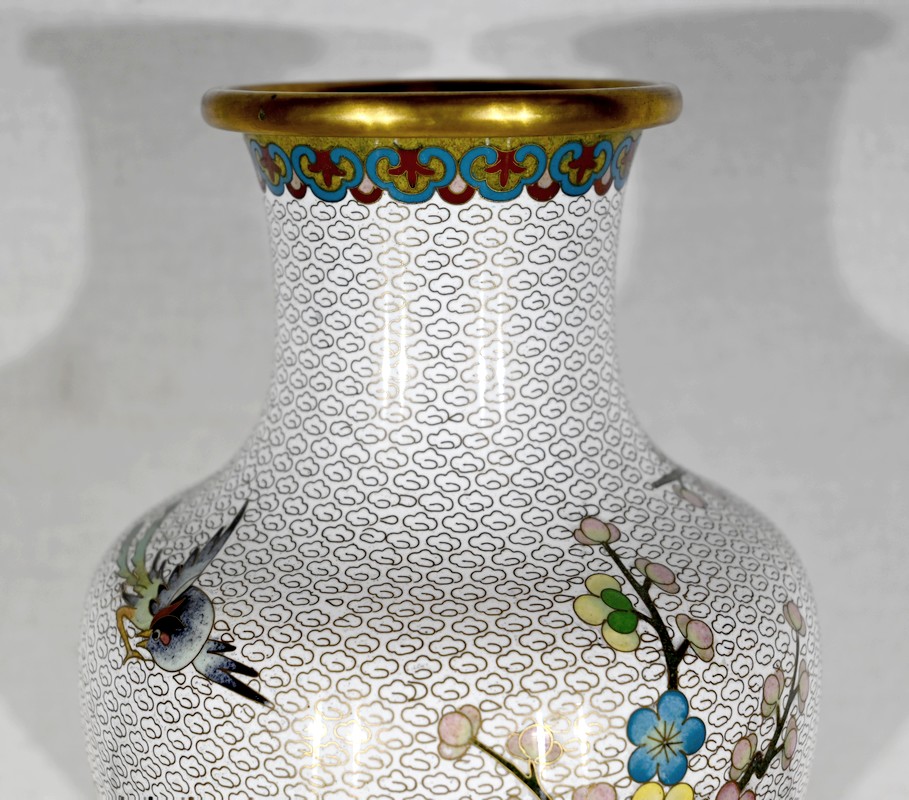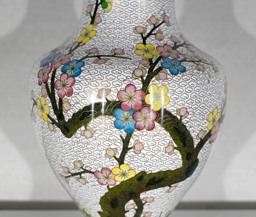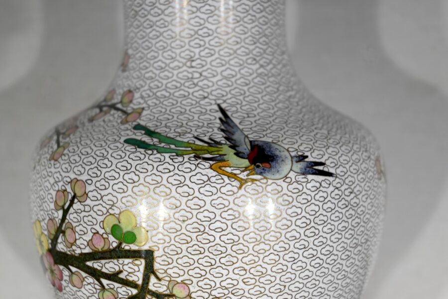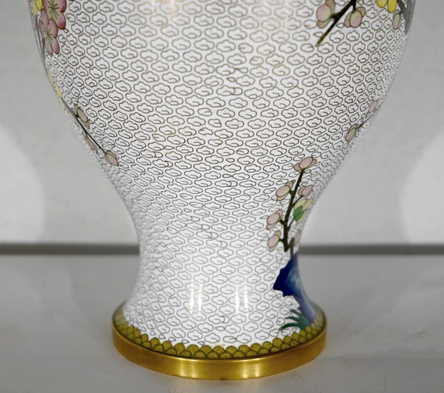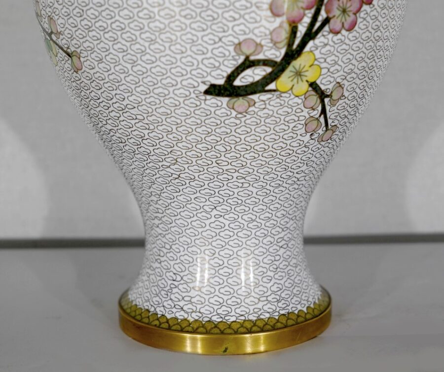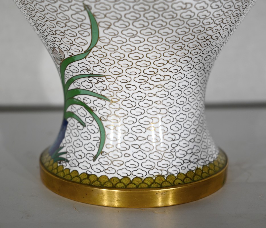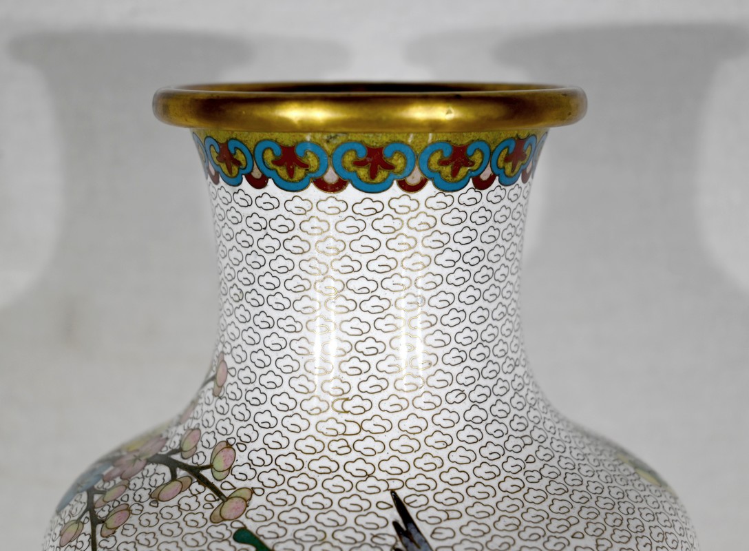 Vase en émail cloisonnée, à panse ovoïde pointée vers le bas, et au bord rétréci.