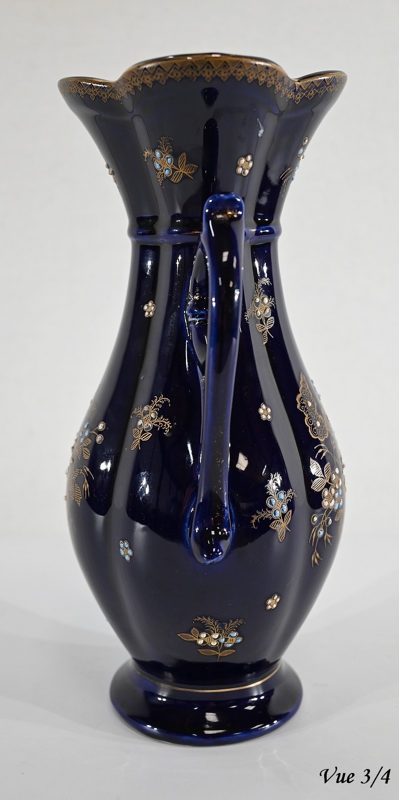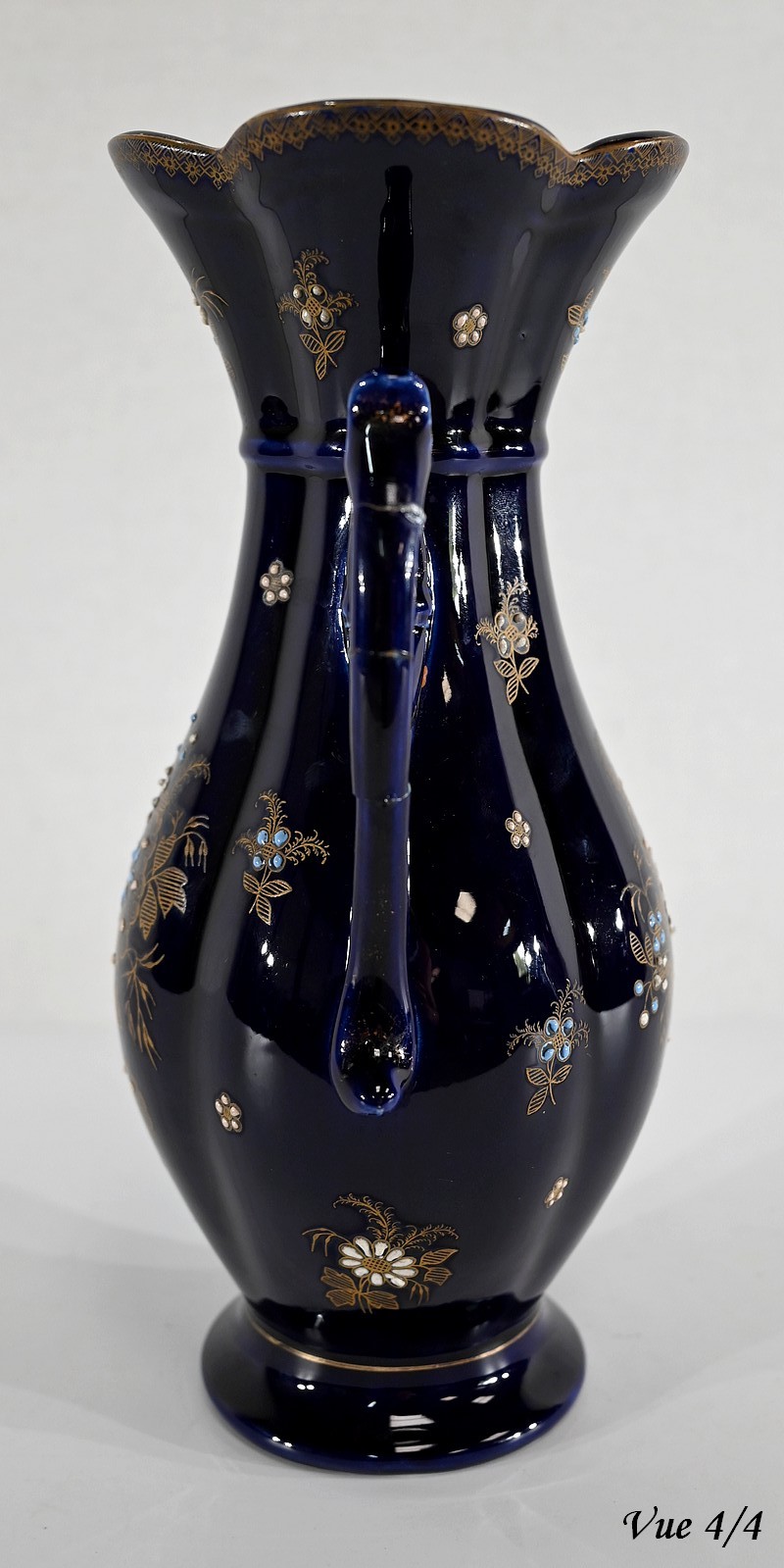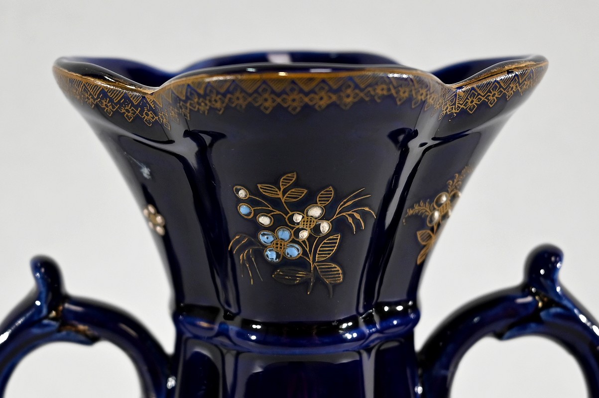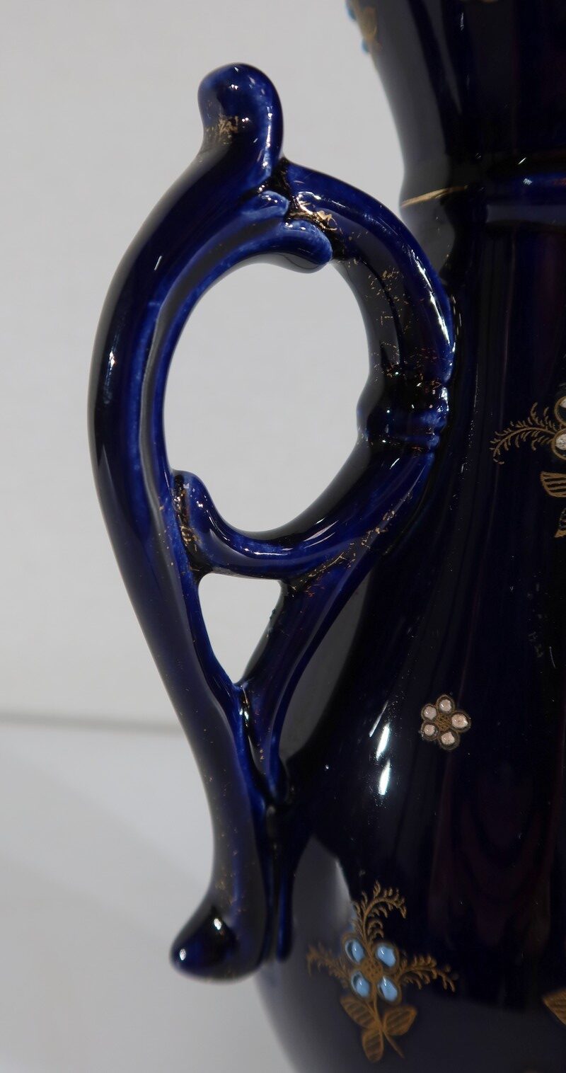 Ce vase est muni de deux anses, formées de fleurs en trompettes, et dont l’une d’elle présente des traces d’accident.
