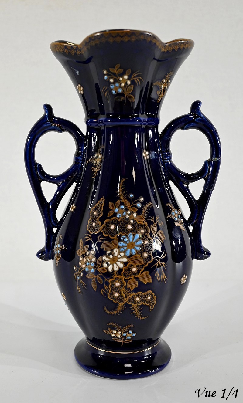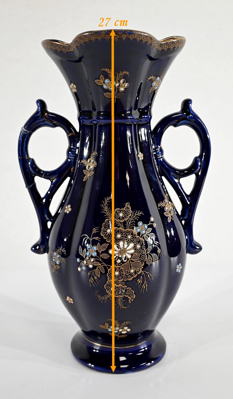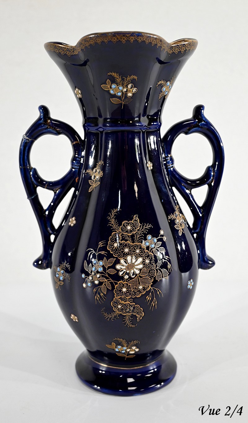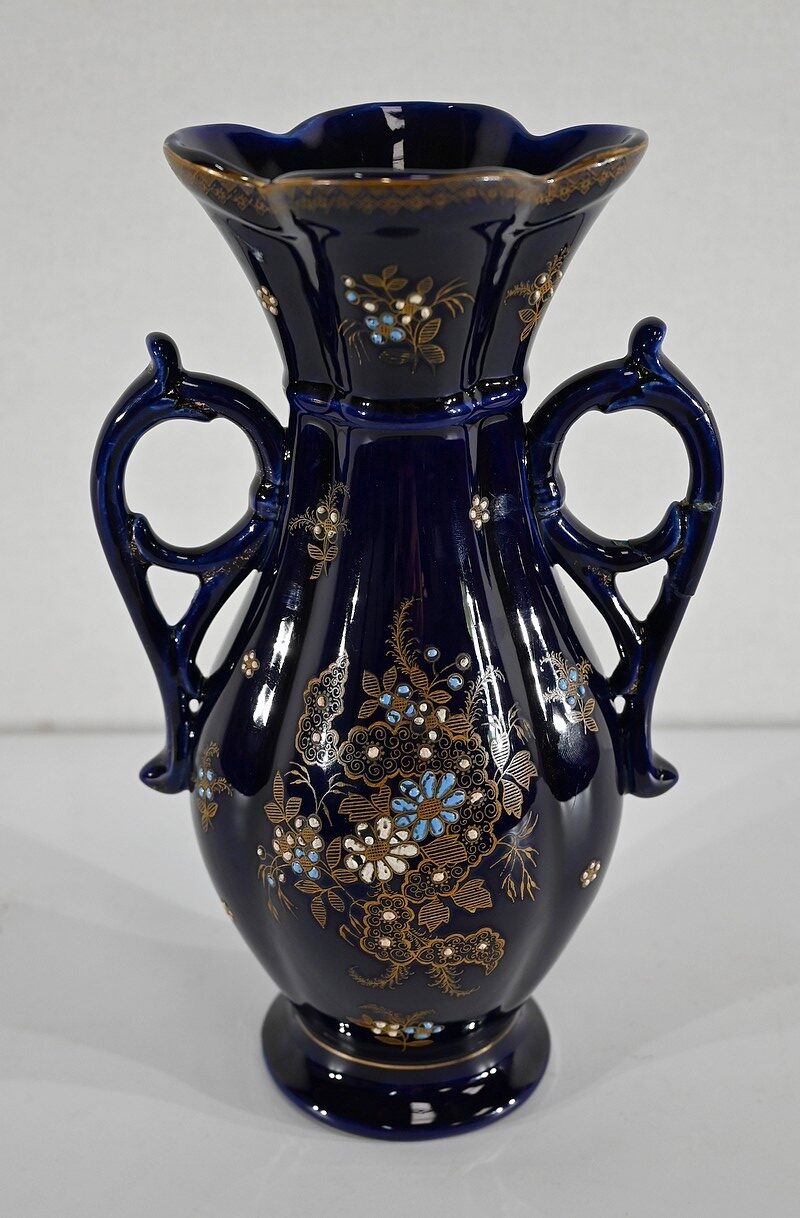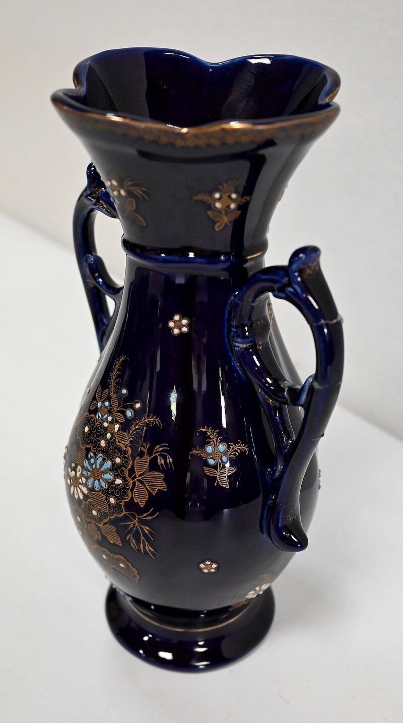 Ce vase est muni de deux anses, formées de fleurs en trompettes, et dont l’une d’elle présente des traces d’accident.