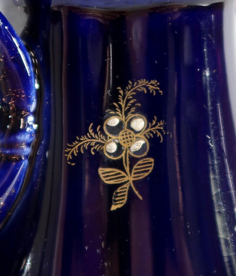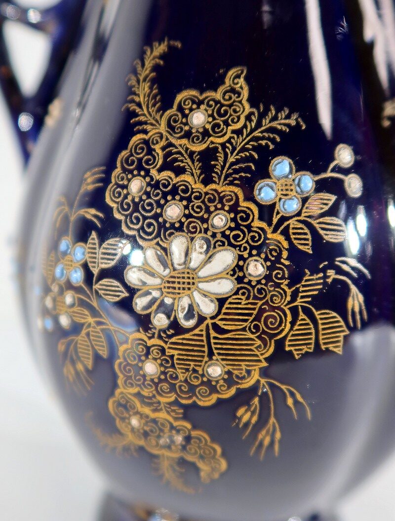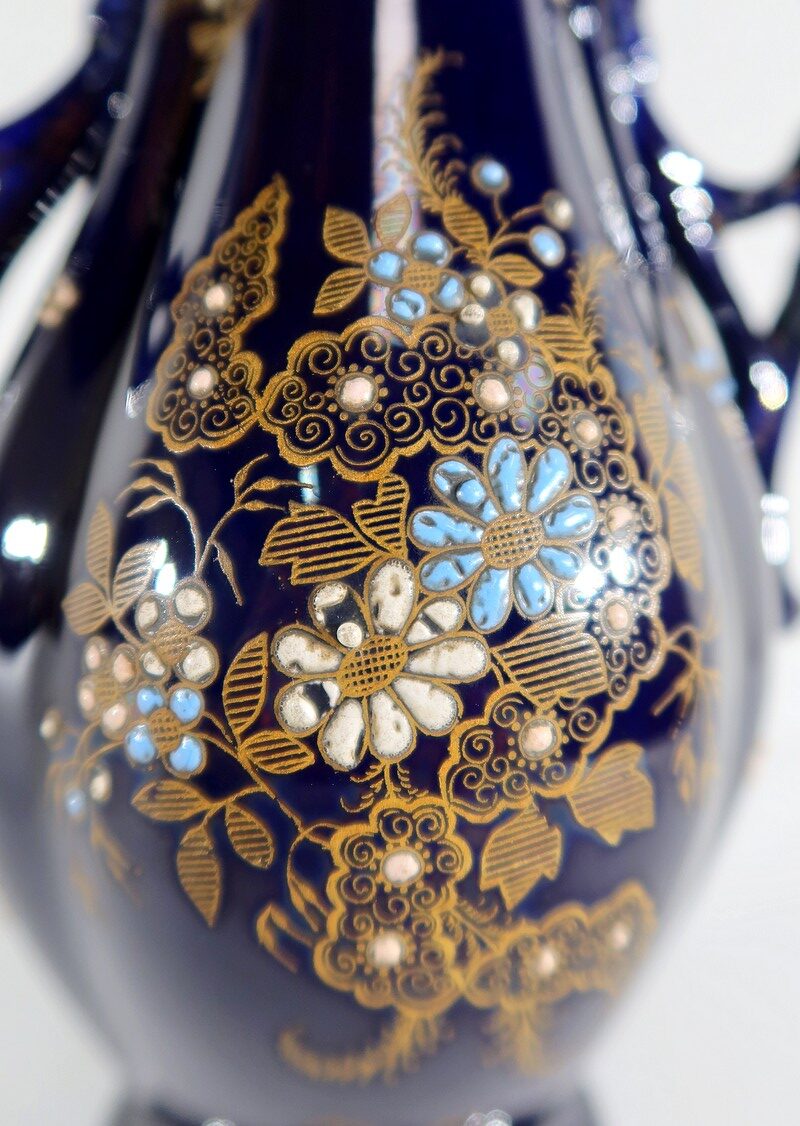 Il est par ailleurs décoré de motifs dorés et en relief : fleurs à volutes ou en émaux turquoises et blancs, et feuillages striés sur fond bleu nuit.