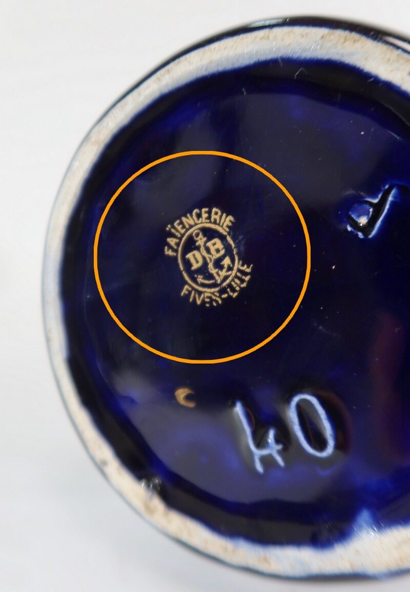 Le dessous porte l’estampille de la Maison De Bruyn, faïencerie Lilloise située quartier Fives, et en activité de 1864 à 1950.