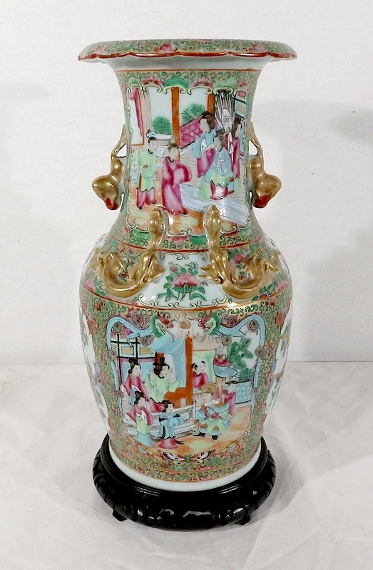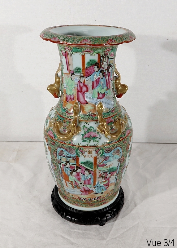 Vase balustre en porcelaine chinoise de Canton richement décoré de personnages pittoresques, d’animaux, de fleurs et de feuillages. Celui-ci est posé sur son socle en bois.