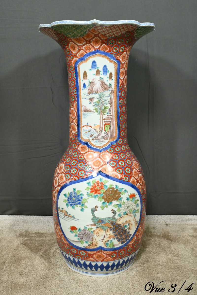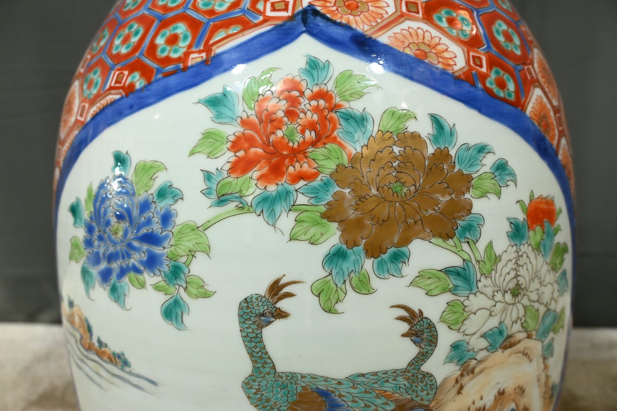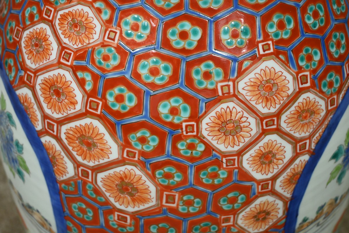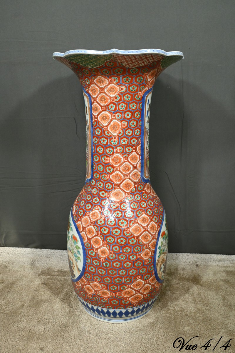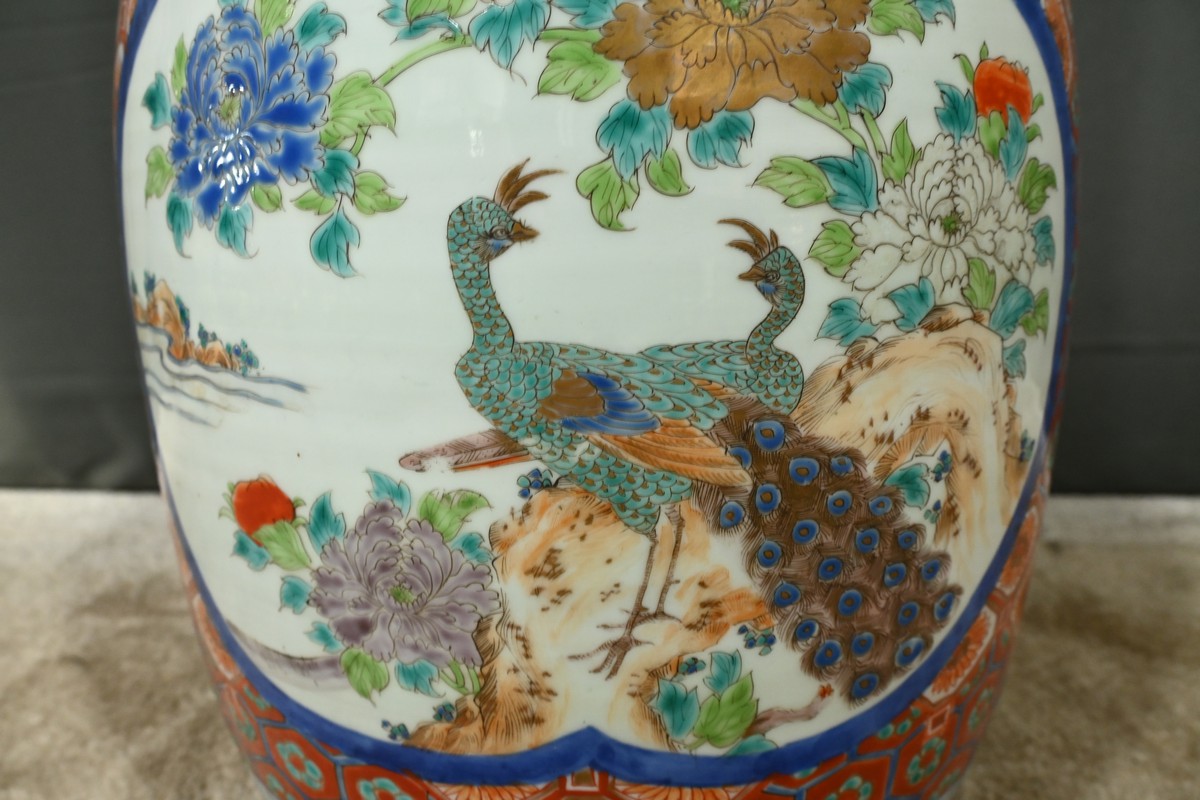 Ce grand vase en porcelaine polychrome, provenant du Japon et datant de l’époque Meiji (1868-1912), est une pièce remarquable qui illustre l’excellence artistique et technique de cette période.