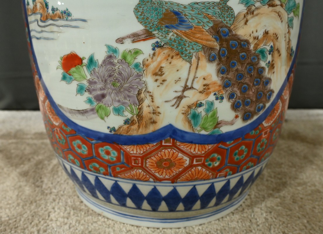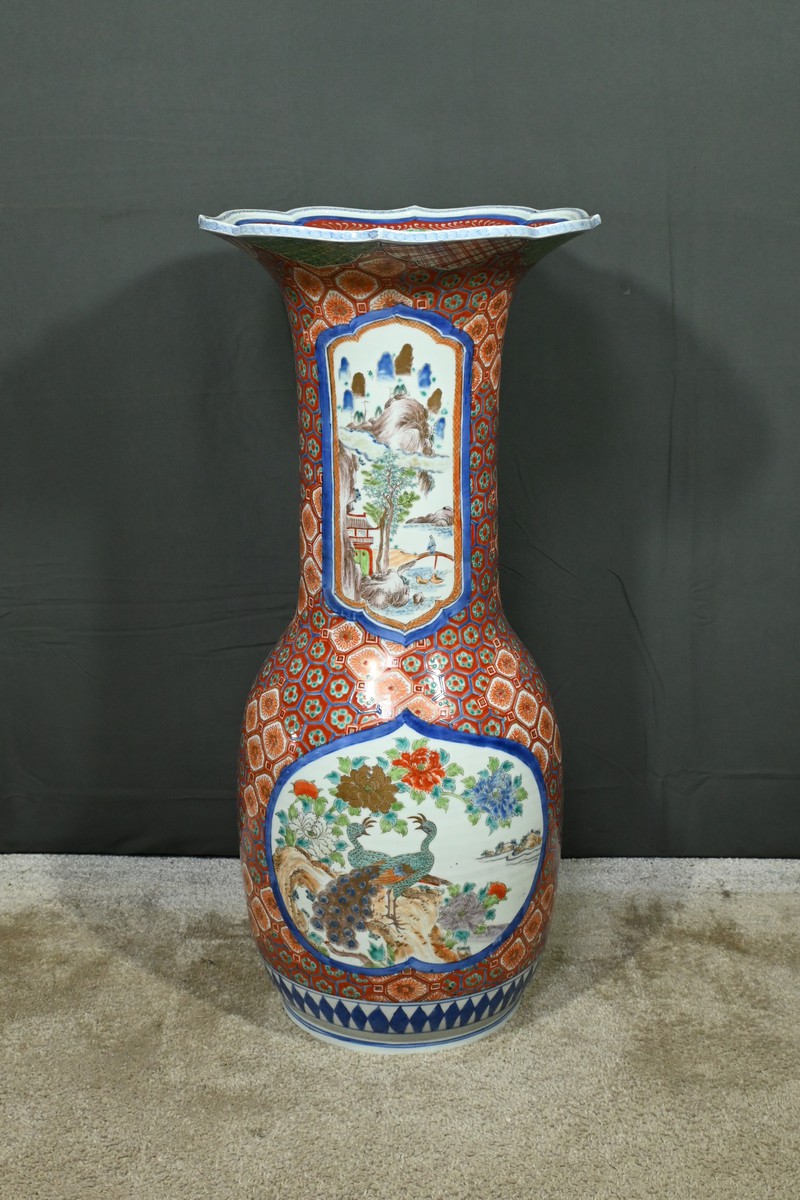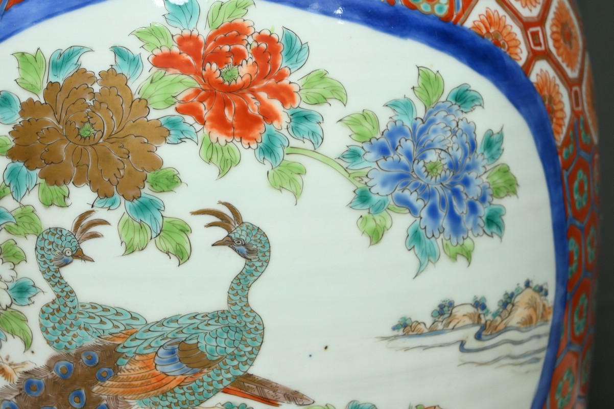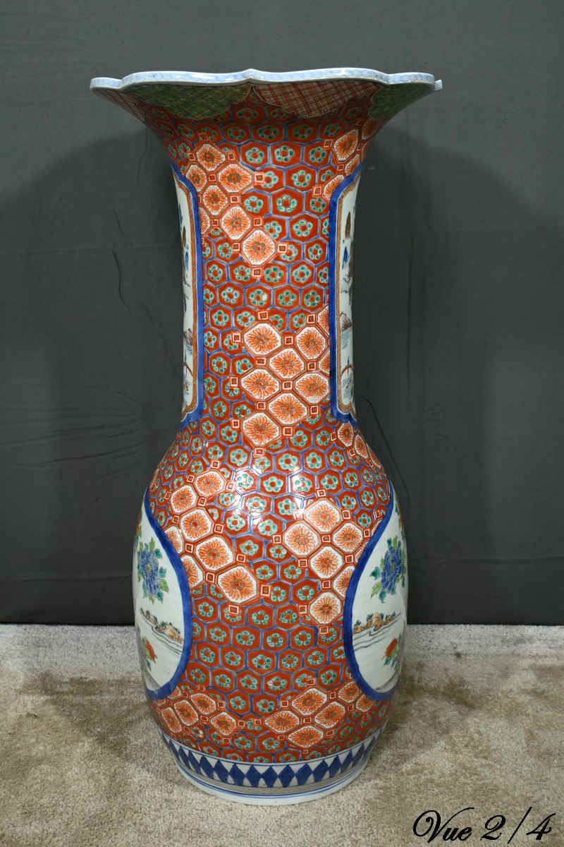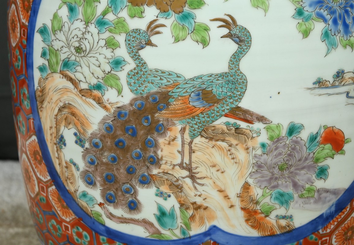 Ce grand vase en porcelaine polychrome, provenant du Japon et datant de l’époque Meiji (1868-1912), est une pièce remarquable qui illustre l’excellence artistique et technique de cette période.