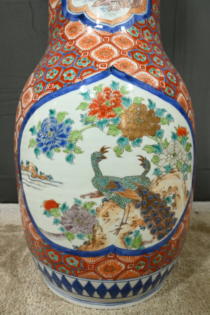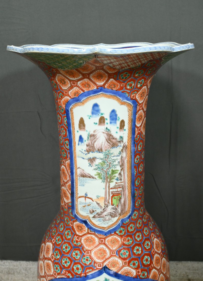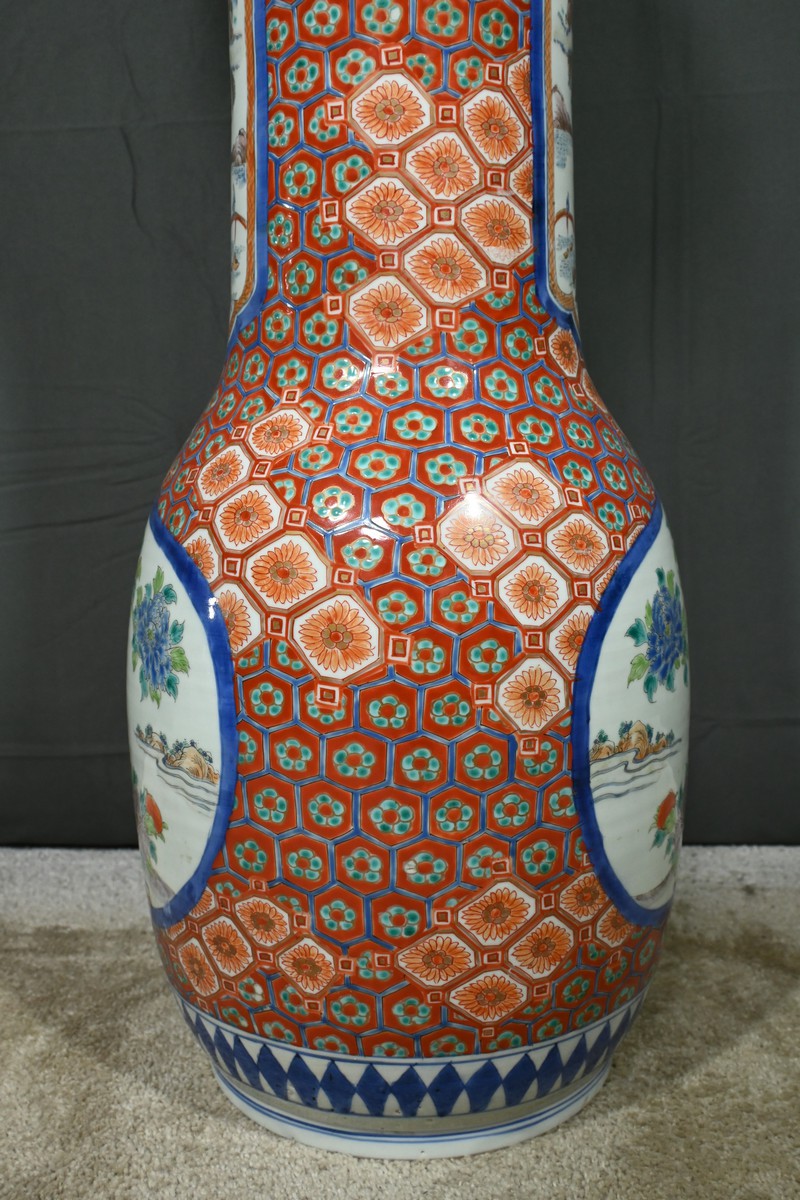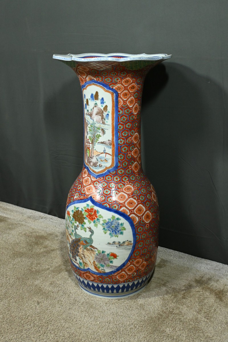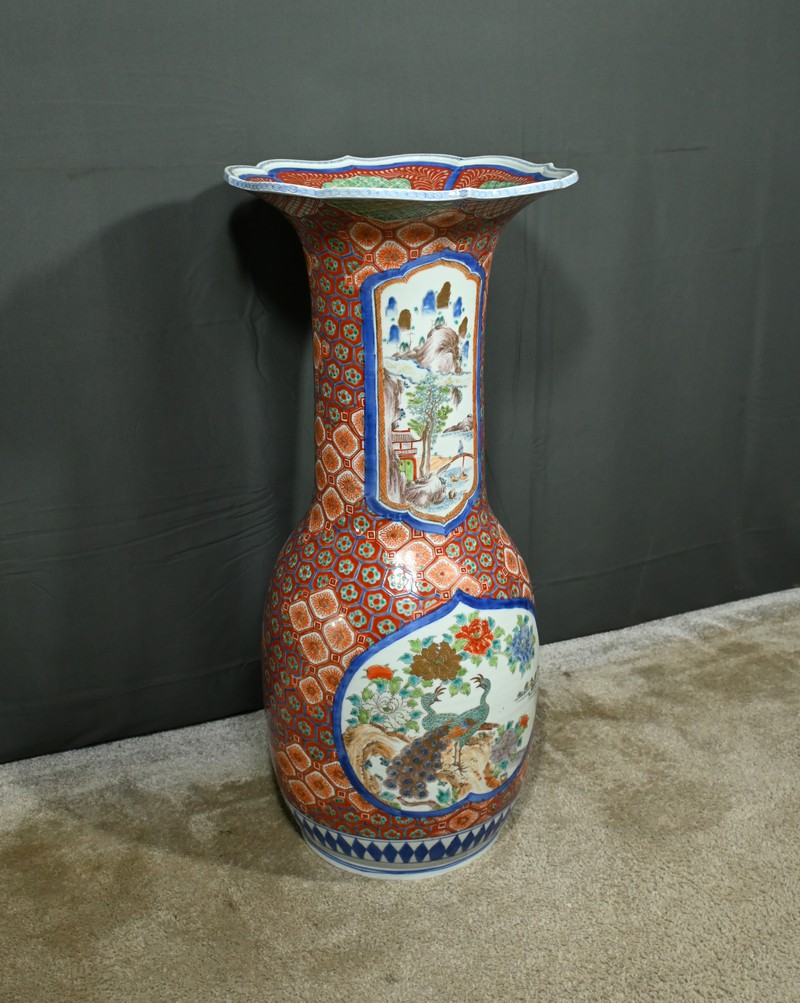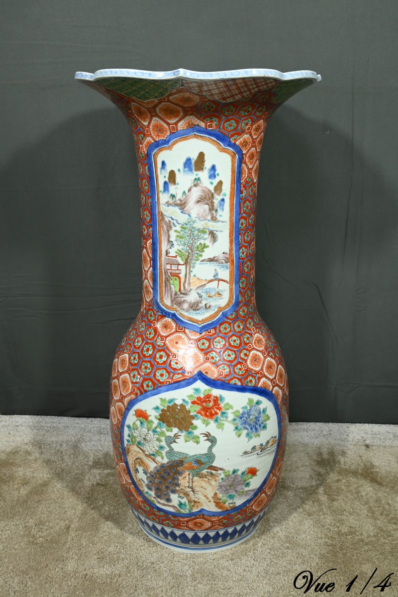Ce grand vase en porcelaine polychrome, provenant du Japon et datant de l’époque Meiji (1868-1912), est une pièce remarquable qui illustre l’excellence artistique et technique de cette période.