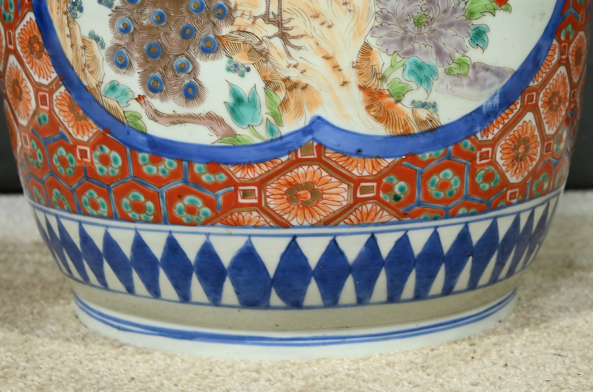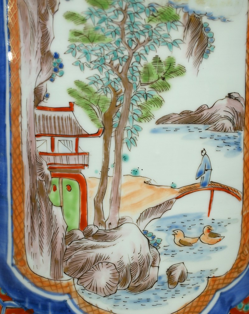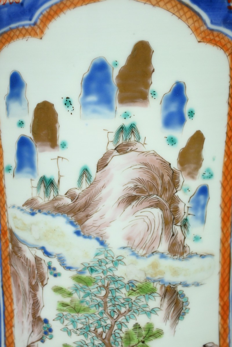 Les paysages traditionnels et les paons, peints dans des réserves, sont mis en valeur par un fond vermiculé et fleuri.