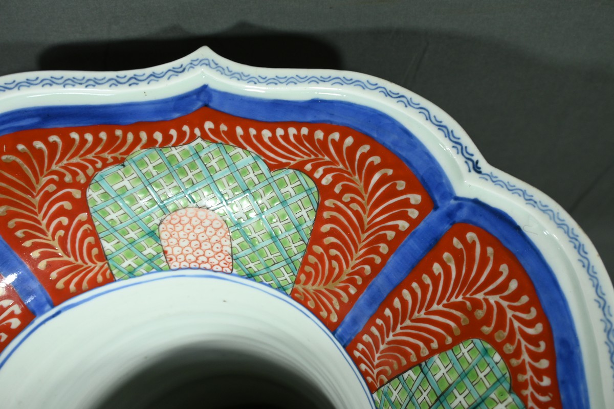 Le vase présente un bord chantourné et une collerette échancrée, ajoutant une touche d’élégance à sa forme.