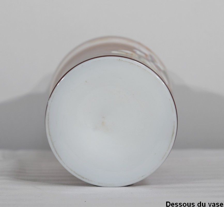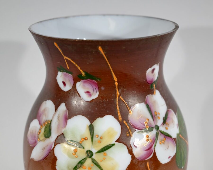 La panse légèrement bombée présente des décors de branches de fleurs et de bourgeons dans des tons violet, mauve et vert sur un fond marron dégradé.