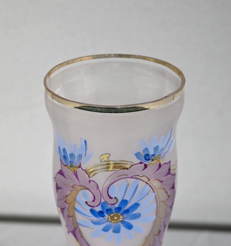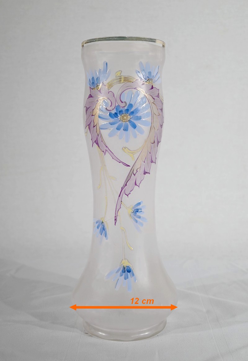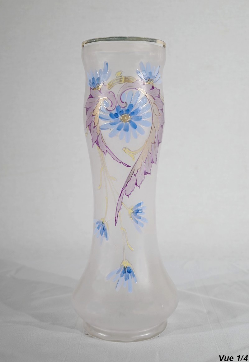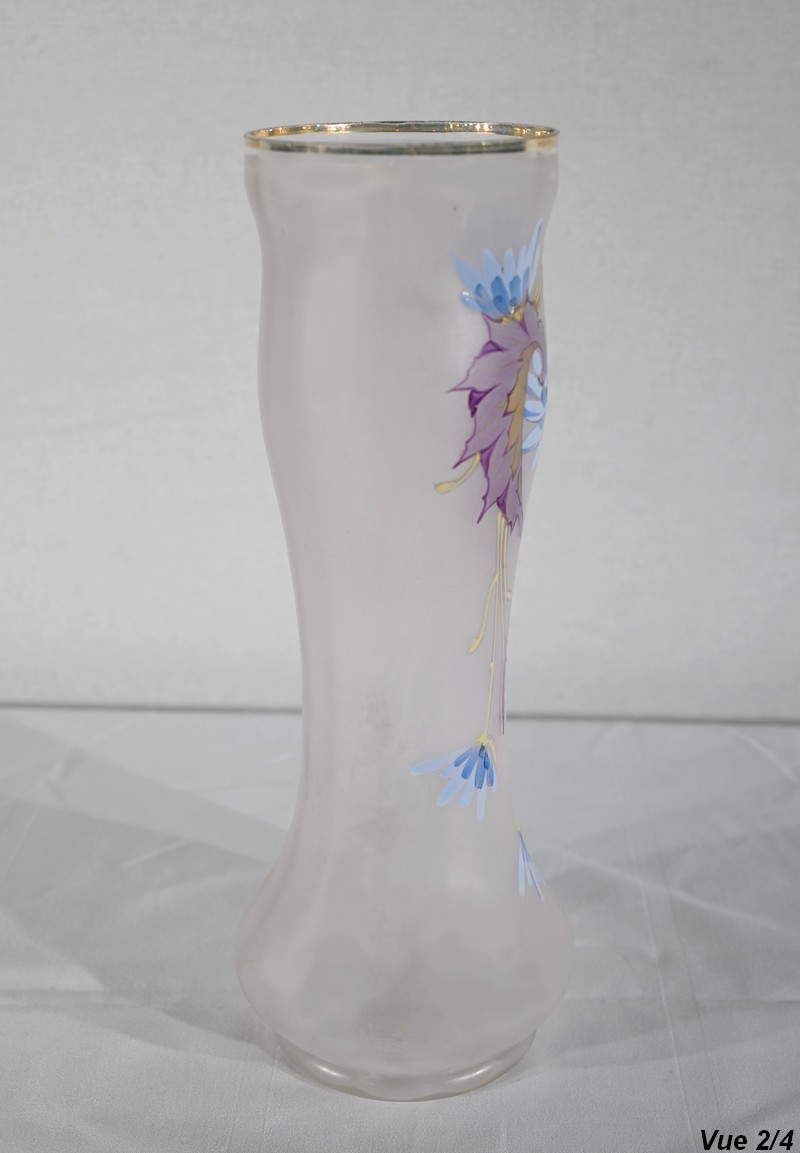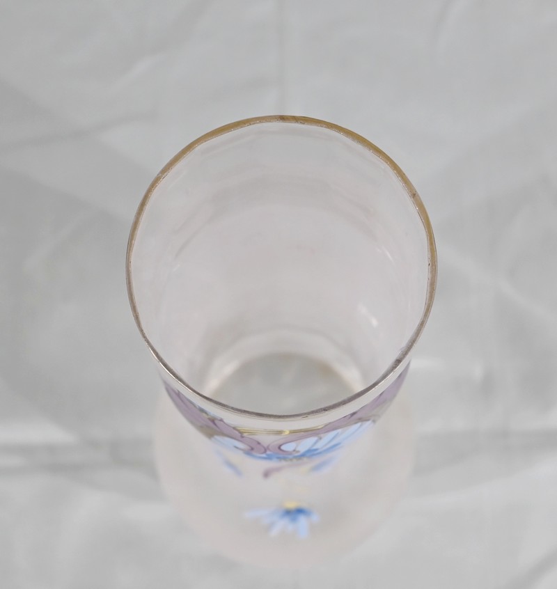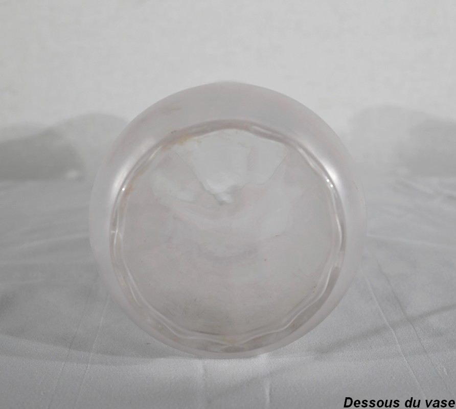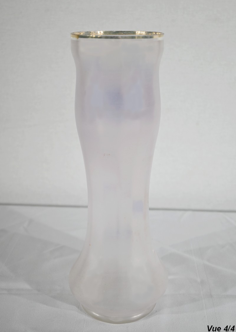 Vase en verre fin opaque à panse rétrécie et assise plate.