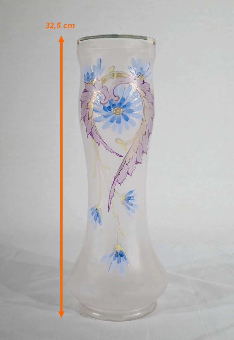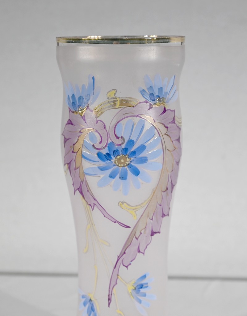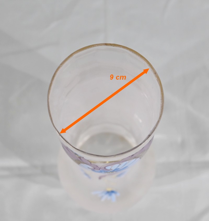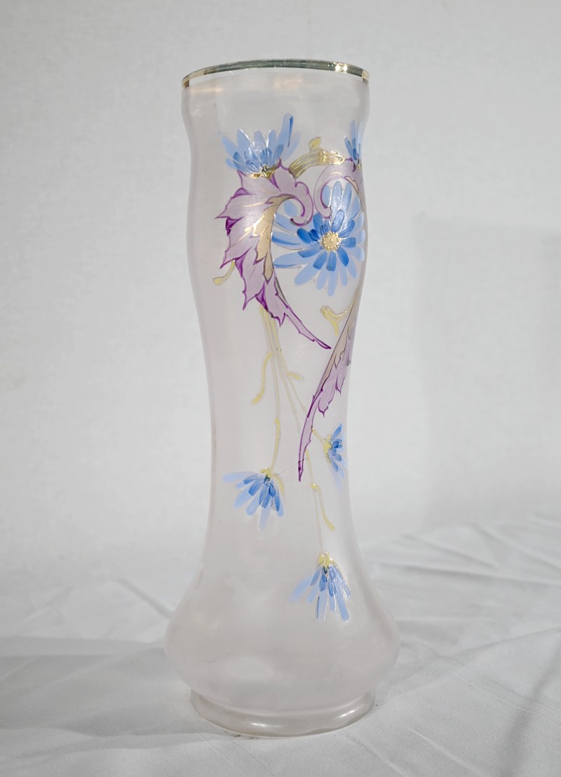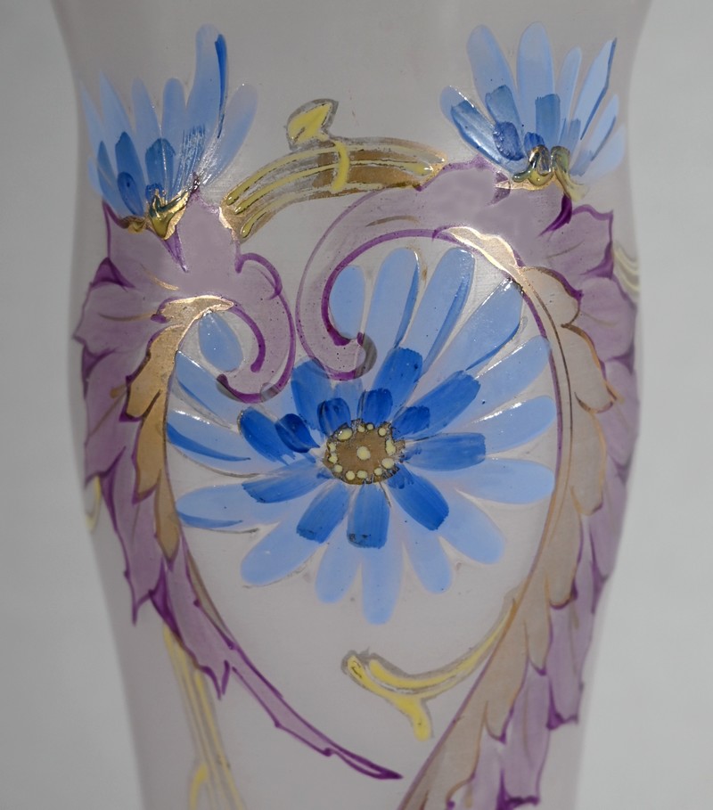 Le haut col renflé et continu est agrémenté de décors polychromes peints, de fleurs et de longues feuilles formant un cœur, dans des tons pastel bleu, jaune et violet.