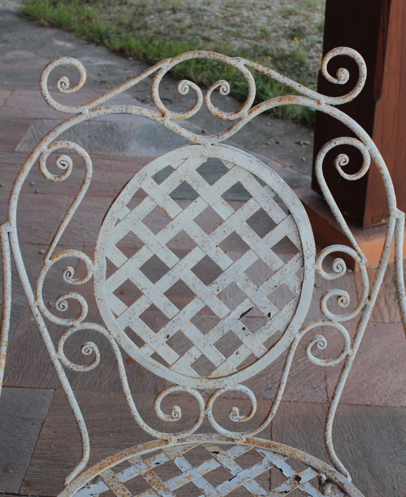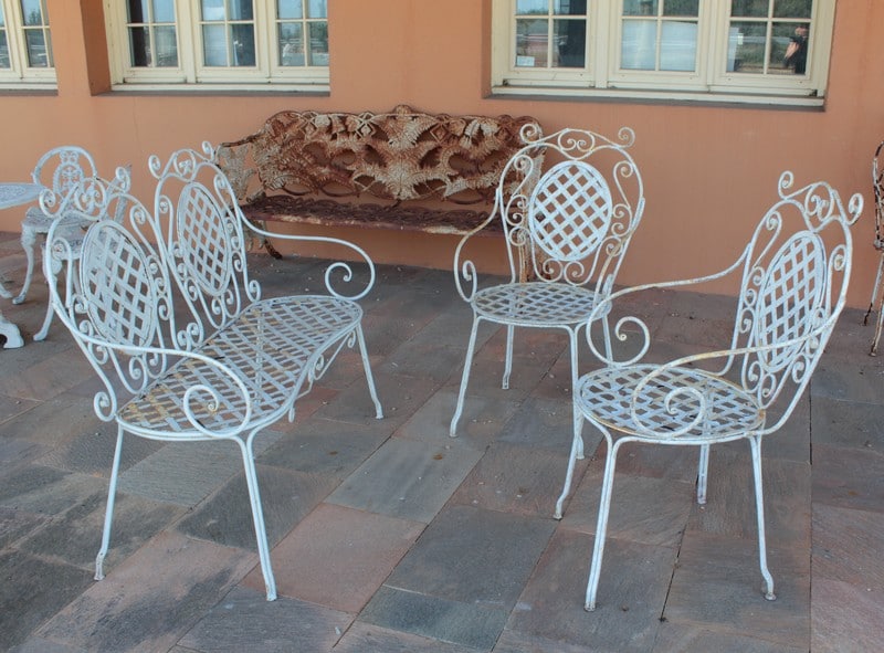 Banquette à deux places et ses deux chaises de jardin en fer forgé dont les assises et dossiers sont en croisillons encadrés d’arabesques fines.