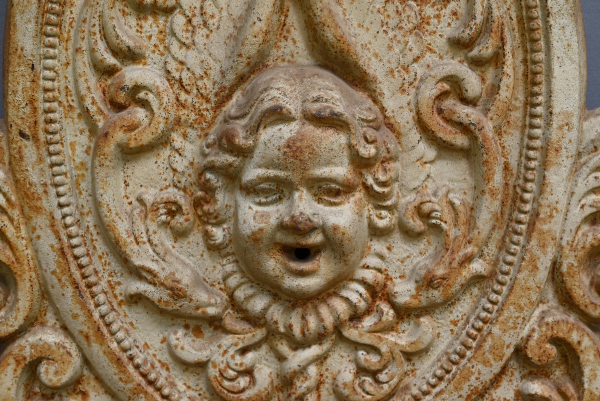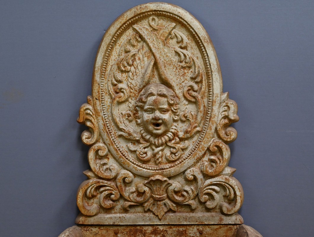 Sur la plaque arrière, un chérubin finement sculpté capte immédiatement l’attention.