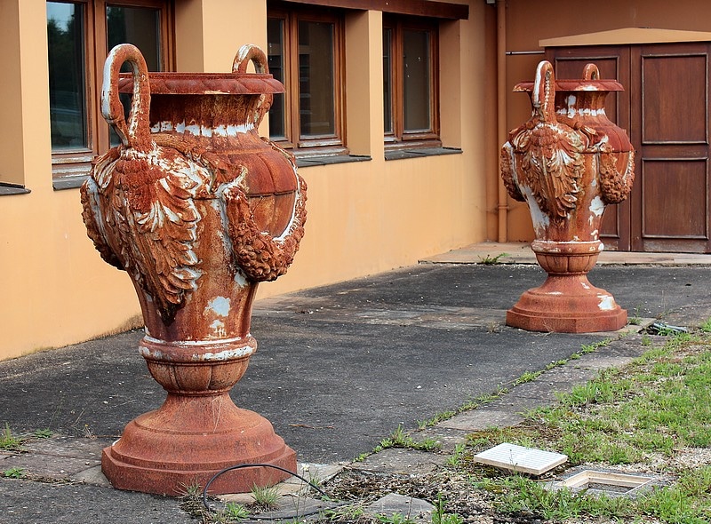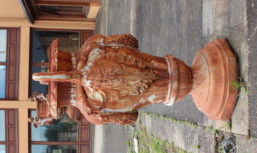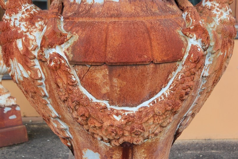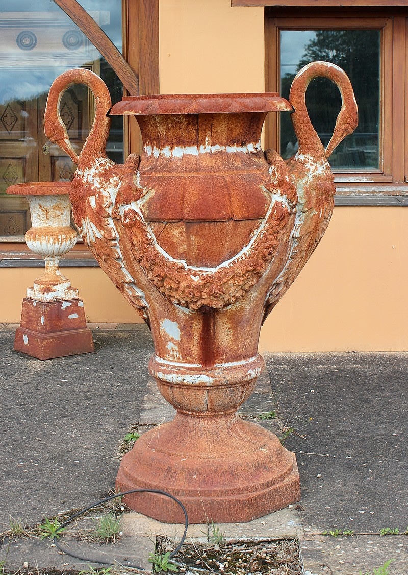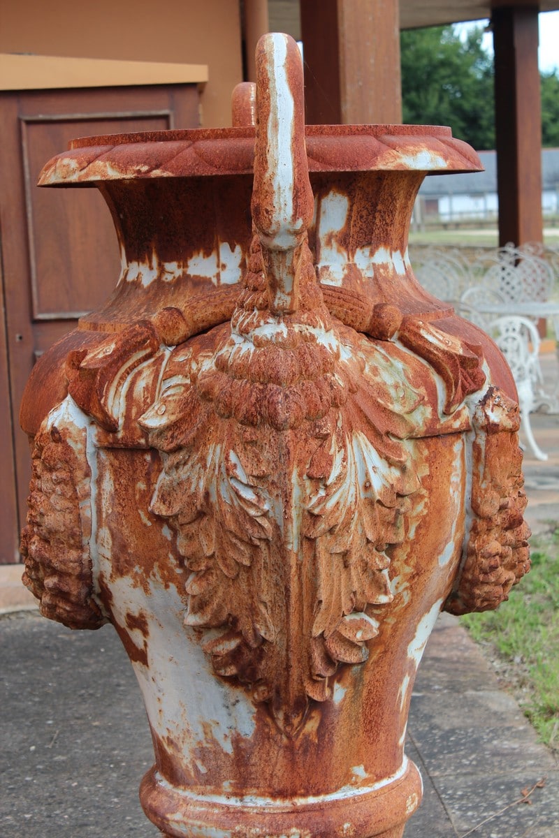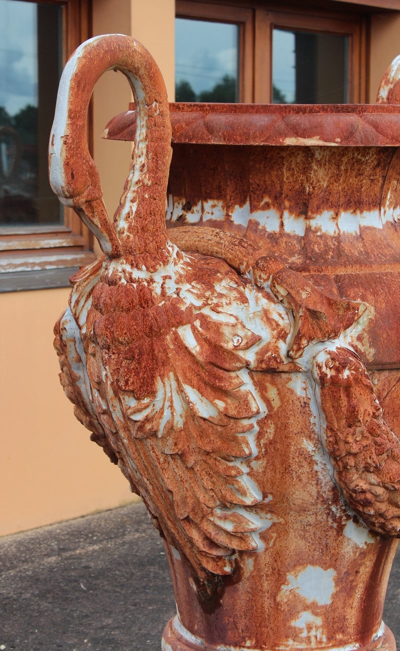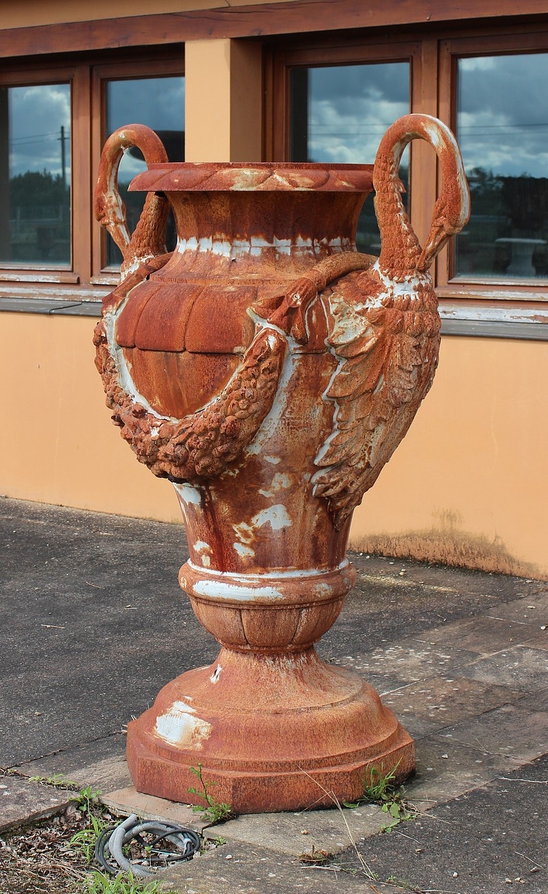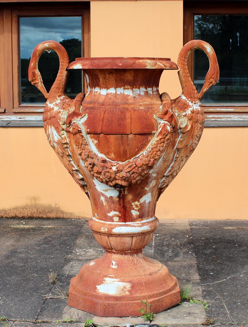 Grand vase ornemental de jardin en fonte, en forme d’amphore, dont les anses de chaque côté sont en cols de cygnes.