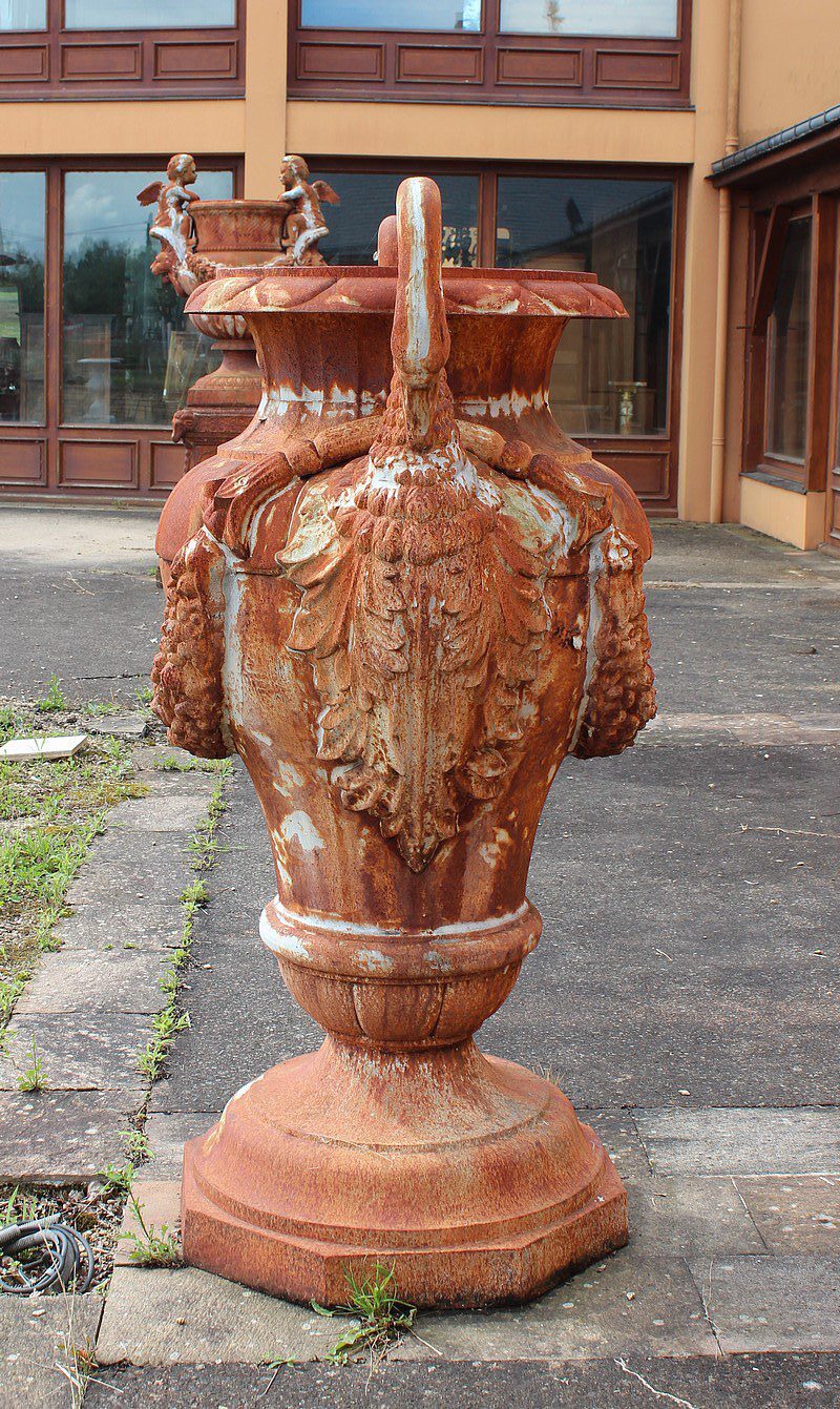 Grand vase ornemental de jardin en fonte, en forme d’amphore, dont les anses de chaque côté sont en cols de cygnes.