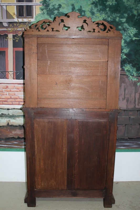 Petit buffet-dressoir en chêne clair dans le goût Renaissance ouvrant à une porte ornée de sculptures de fruits et de feuilles et un tiroir sculpté de rinceaux. Les montant sont également garnis de chutes de grappes de fruits. Il repose sur des pieds ‘miche’.
