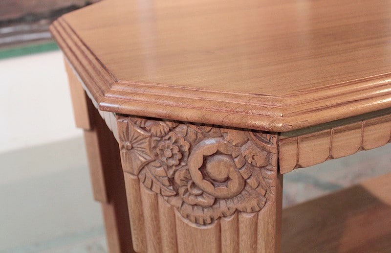 Table-desserte Art-Déco en acajou blond massif, aux angles coupés. Les pieds sont sculptés de fleurs stylisées et réunis par un plateau d’entrejambe.