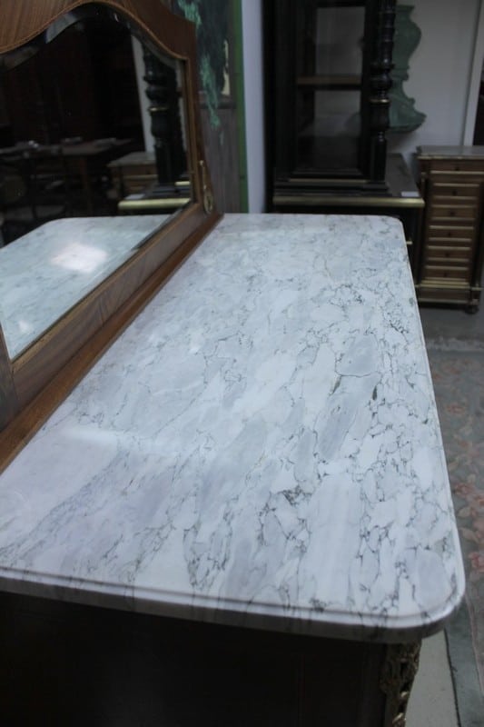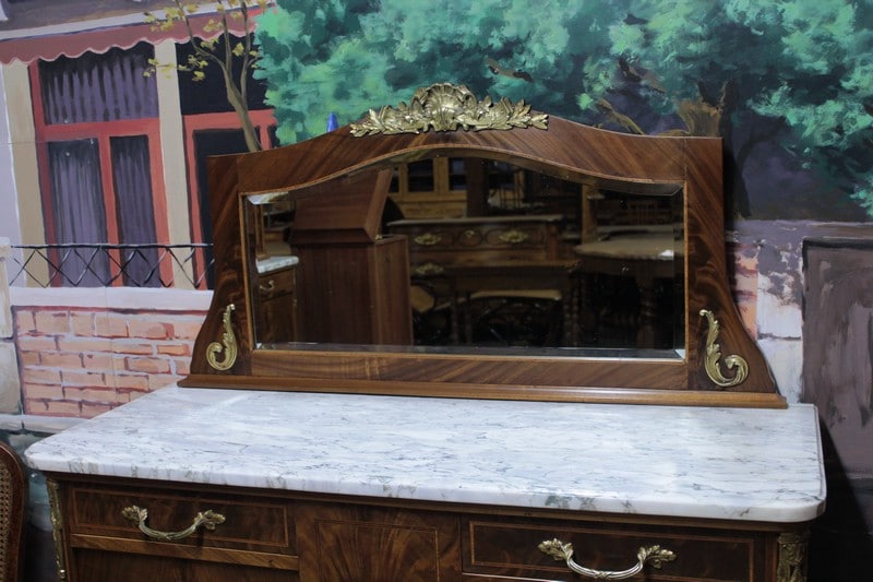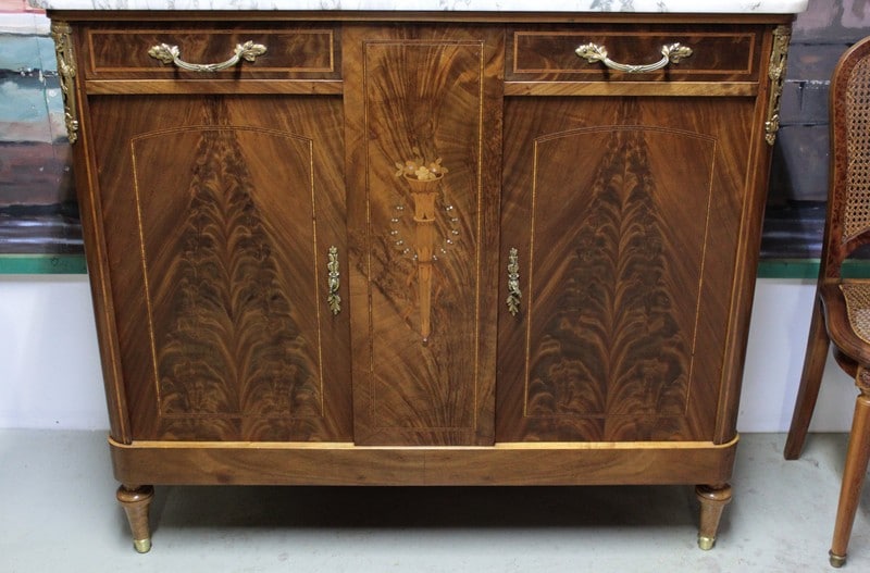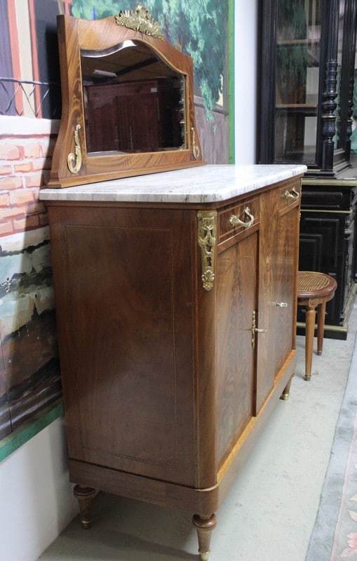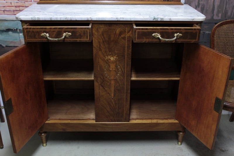 Desserte Art-déco dans le goût Louis XVI en acajou avec filet de citronnier, marqueterie en façade et garnitures de bronze. Son dessus, en marbre blanc veiné gris, est surmonté d’un miroir. Elle ouvre à 2 portes et 2 tiroirs. Époque 1920.