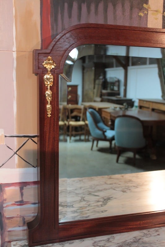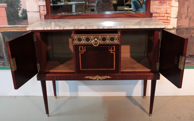 Desserte d’apparat en placage d’ acajou dans le goût Louis XVI avec dessus de marbre veiné blanc/beige surmonté d’un miroir biseauté et reposant sur 4 pieds fuselés à cannelures terminés par des sabots laiton. Elle ouvre par un tiroir dont la façade est habillée de bronze et par 2 portes en ronce d’acajou avec entourage en bois de rose, citronnier et palissandre , elles sont décorées d’une marqueterie en citronnier et bois teintés représentant des fleurs dans un vase. La partie centrale, sous le tiroir, est en acajou moucheté avec ruban en bois de rose et citronnier.