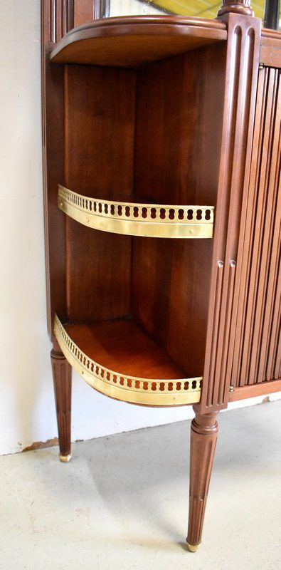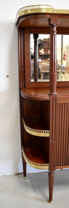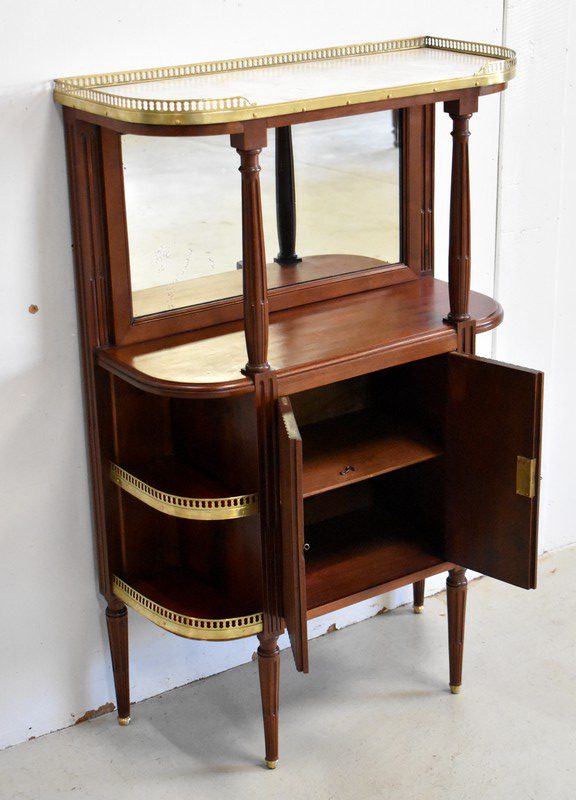 Son Dessus consiste en un Marbre Blanc de Carrare veiné de Gris, ceinturé d’une Galerie Laiton ajourée. Il repose sur deux Colonnes Tournées à Cannelures arrêtées, formant ainsi une Niche. Le Fond de celle-ci est agrémenté en partie centrale d’une Glace au Mercure avec Encadrement Mouluré.