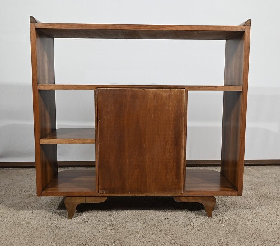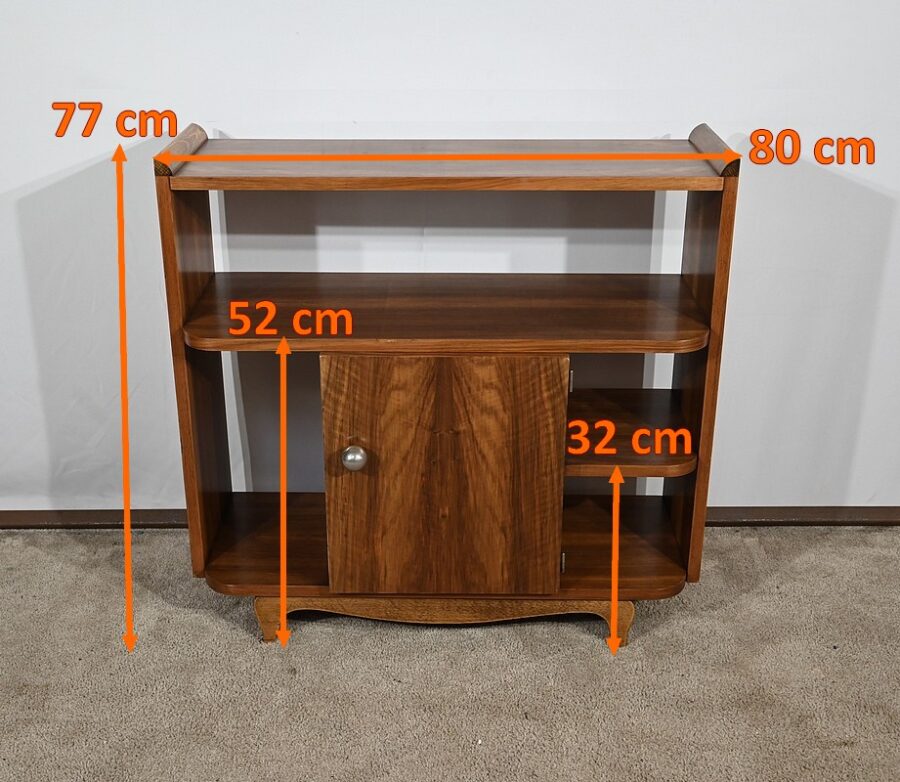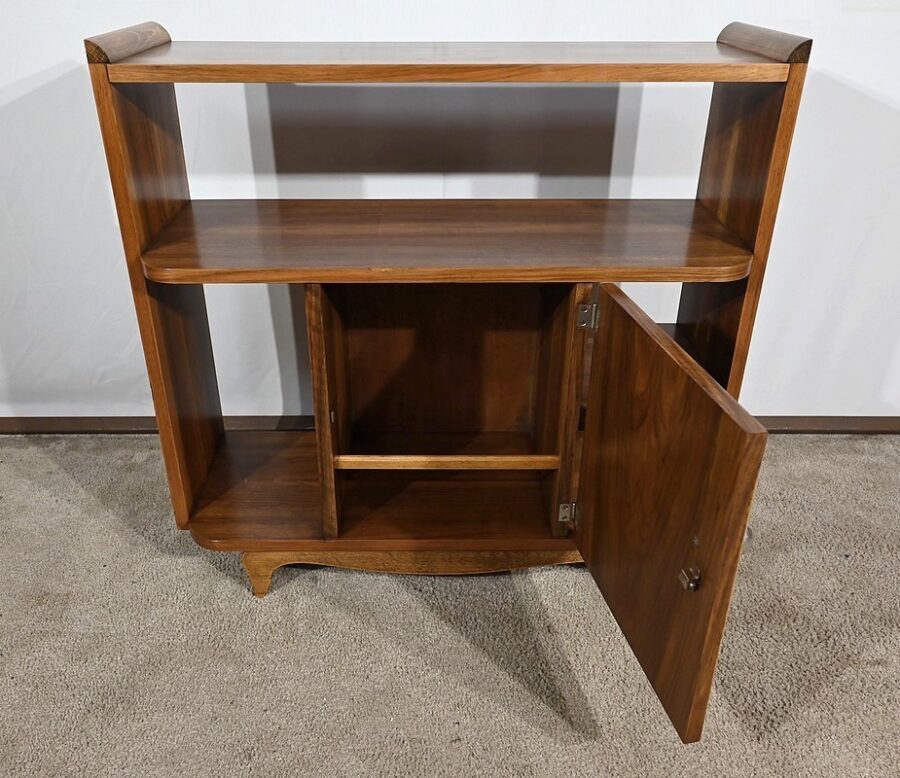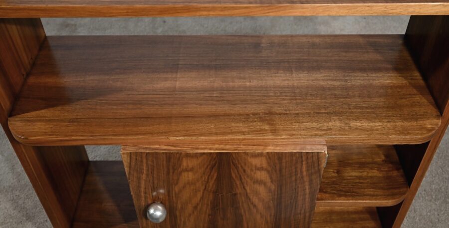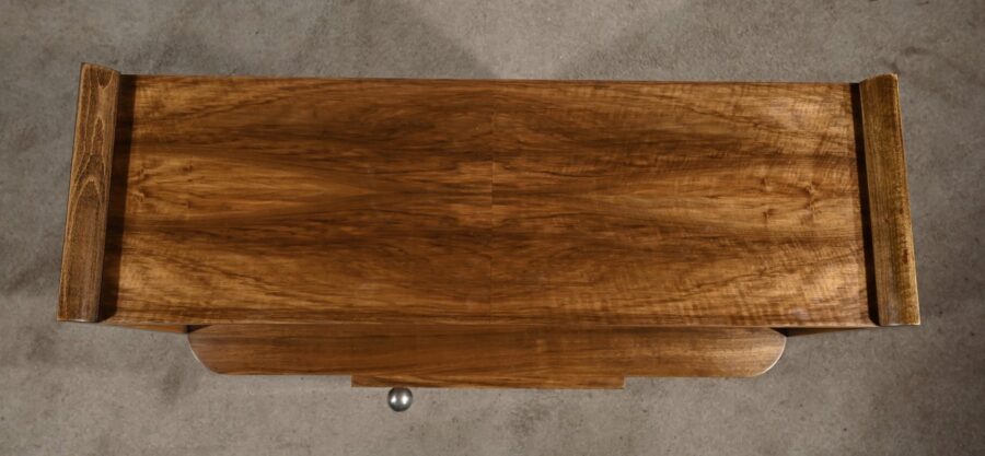 Petit mobilier en noyer massif et placage de noyer, composé d’étagères et d’une porte centrale se tirant par un gros bouton chromé. De chaque côté, des espaces de rangement apportent fonctionnalité à cette desserte Art déco aux lignes courbes et aux pieds à mouvement.