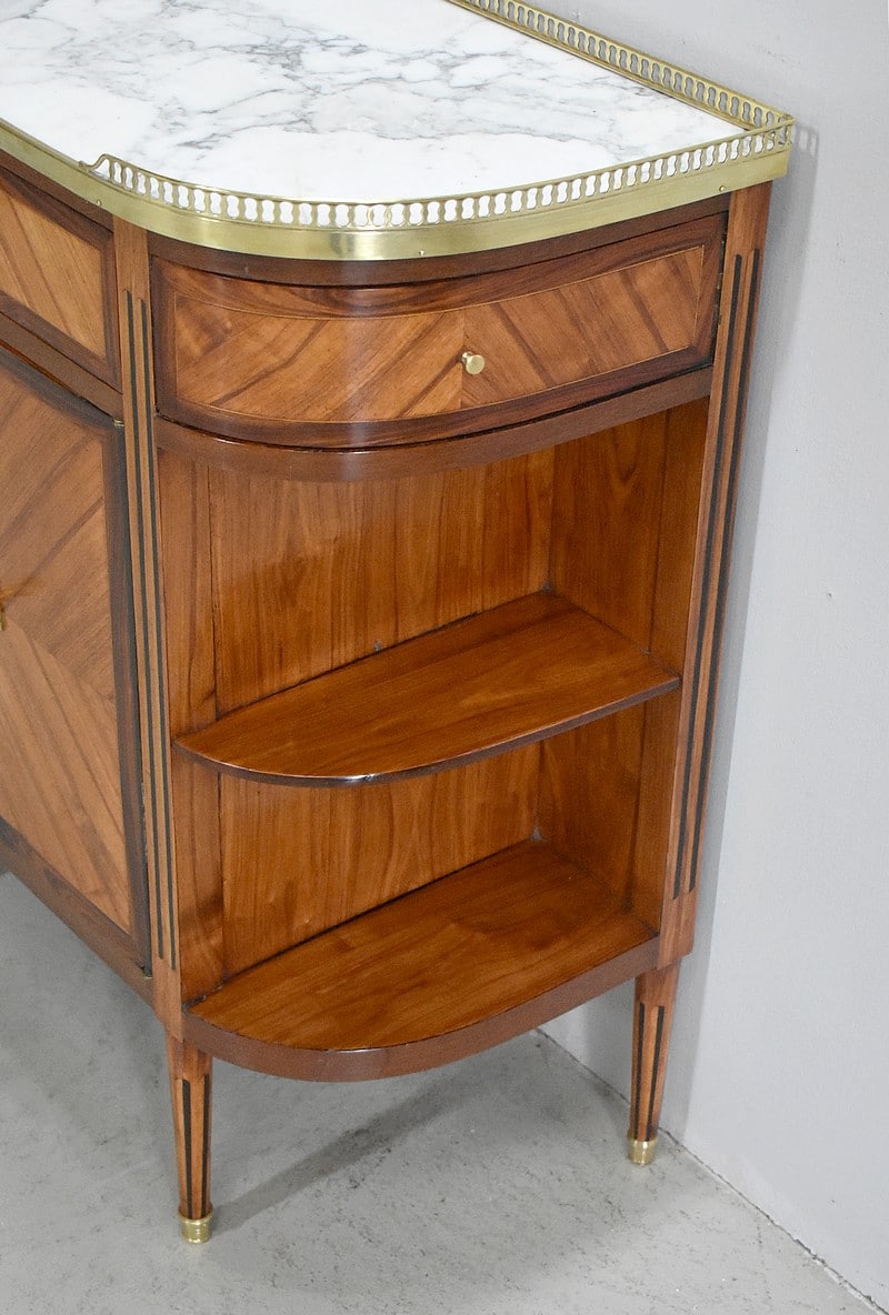 Petit meuble desserte d’entre-deux de style Louis XVI marqueté avec son dessus en marbre blanc de Carrare et bordé d’une galerie ajourée de laiton.