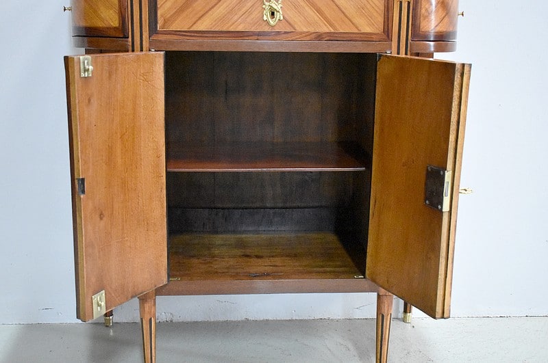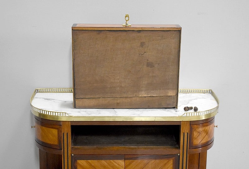 Il ouvre par trois tiroirs en ceinture marquetés de bois de rose, Palissandre de Rio et filets de citronnier. Les deux latéraux pivotants sont découpés en quart de rond et agrémentés de fins boutons et le tiroir central ferme à clef.
