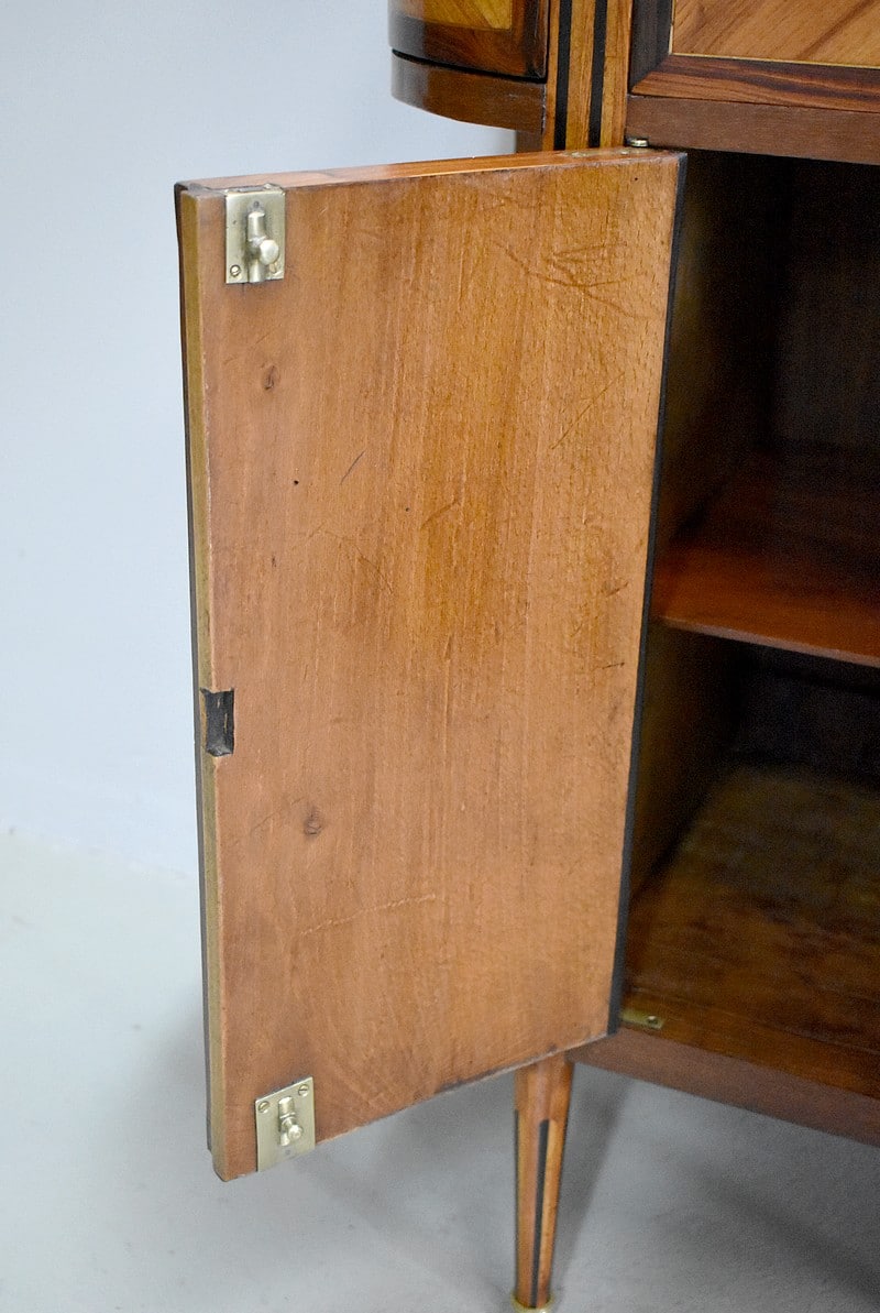 Deux petites portes centrales plaquées d’une marquèterie en aile de papillon en Bois de rose et encadrée de Palissandre sont entourées de montants plats à fausses cannelures marquetées d’Ébène et d’Acajou. Elles ouvrent sur un intérieur composé d’une fine étagère posée sur tasseaux fixes et ferment à clef ainsi que par une fermeture haut et bas à l’intérieur de la porte gauche.