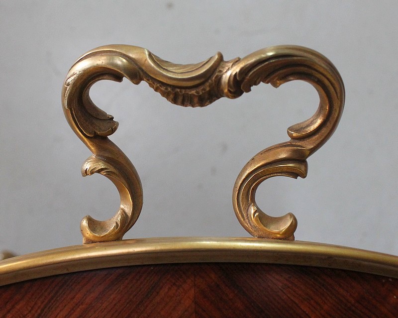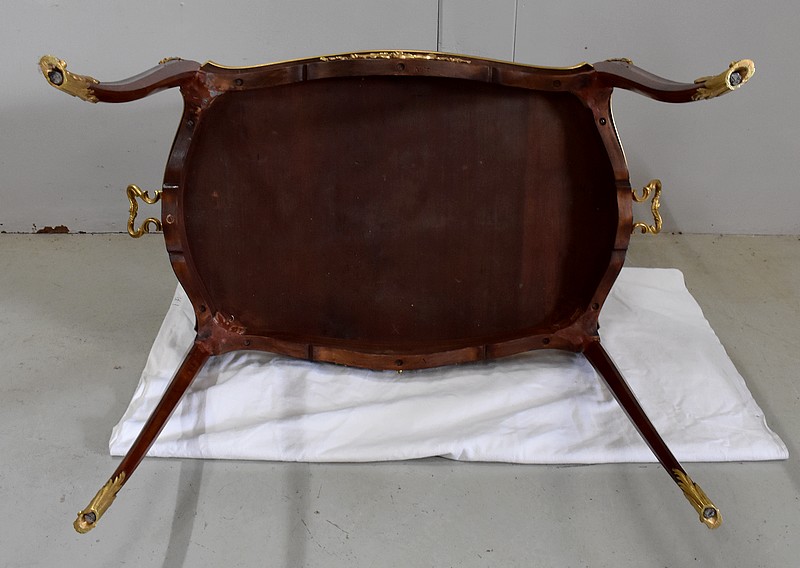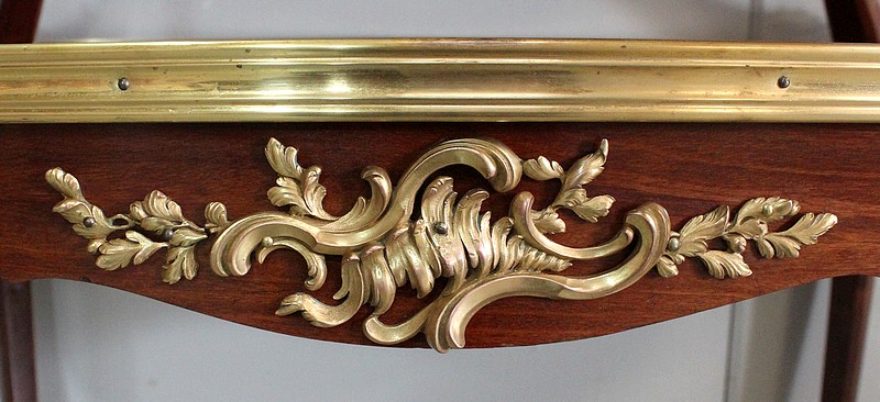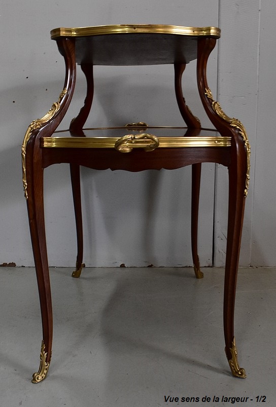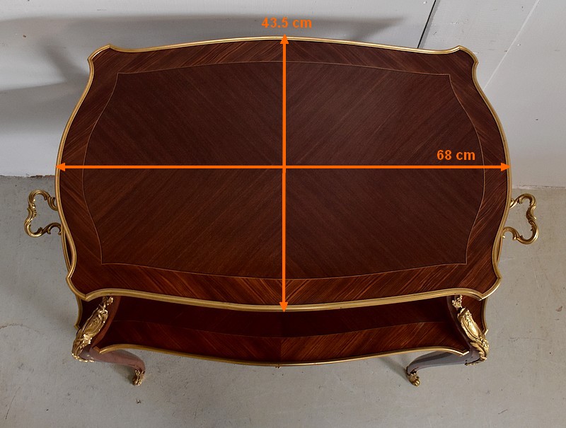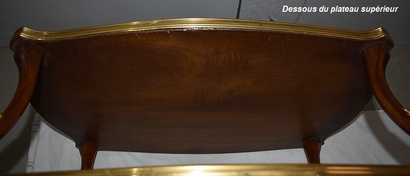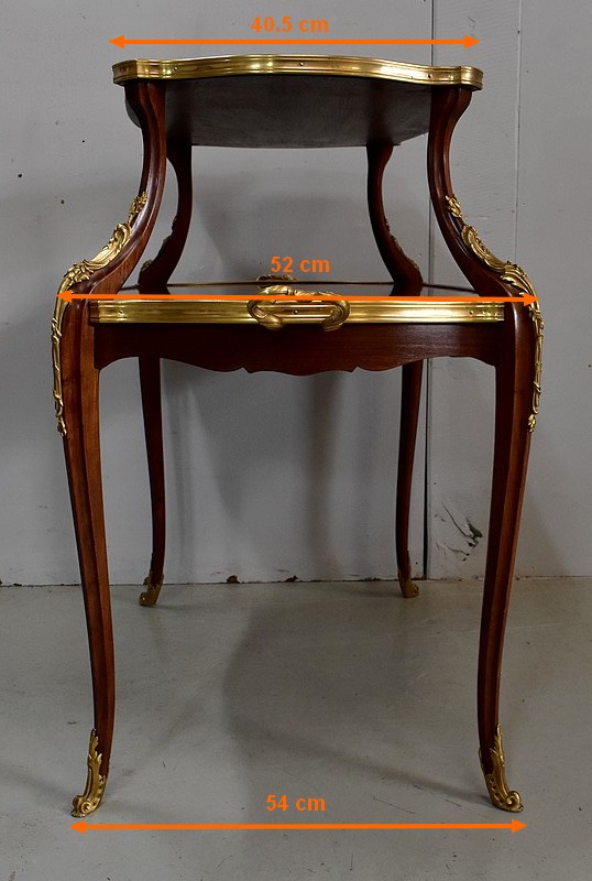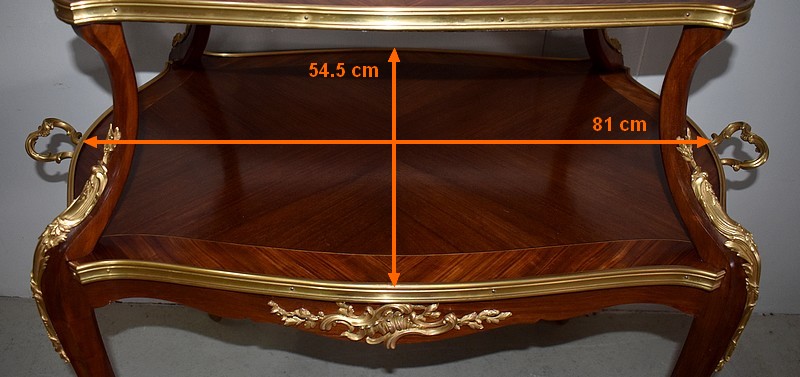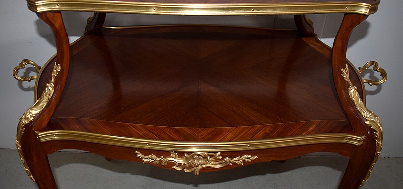 Cette Table bénéficie d’une Ornementation en Bronzes Dorés et Ciselés, tels que Chutes d’angles, Cul-de-Lampe et Doubles Sabots. De plus, deux poignées Ajourées et Ouvragées sont fixées sur la baguette en Laiton du plus grand des plateaux.