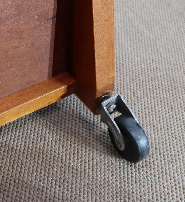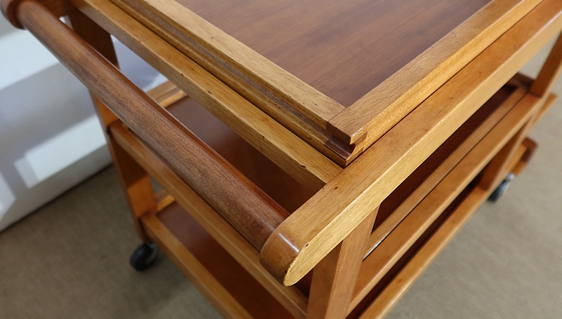 Desserte roulante en Acajou blond disposant d’un plateau supérieur amovible munis de gorge à ses extrémités pour une prise en main optimale. Ce plateau de bonne profondeur est idéal pour un service à table ou un repas individuel.