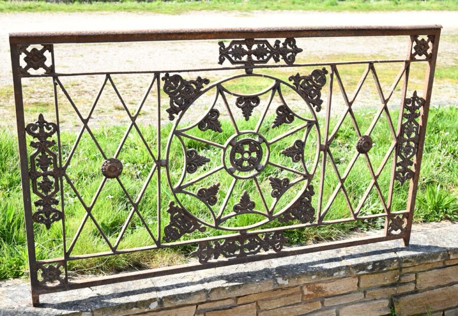 Ce garde-corps présente de nombreux décors complexes en fonte tels que des rosaces, des fleurs de lys ou des volutes.