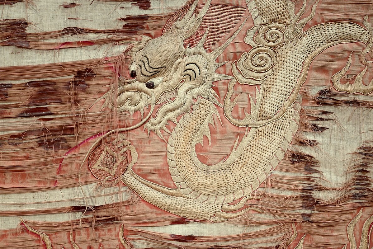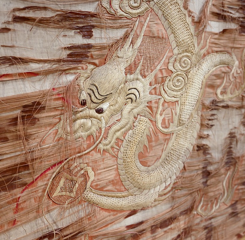 Le cadre central de cet écran de cheminée est garni d’un tissu d’origine en l’état. Entre les fils de soie usités, un grand dragon tissé avec minutie semble descendre du ciel.
