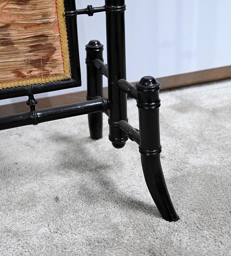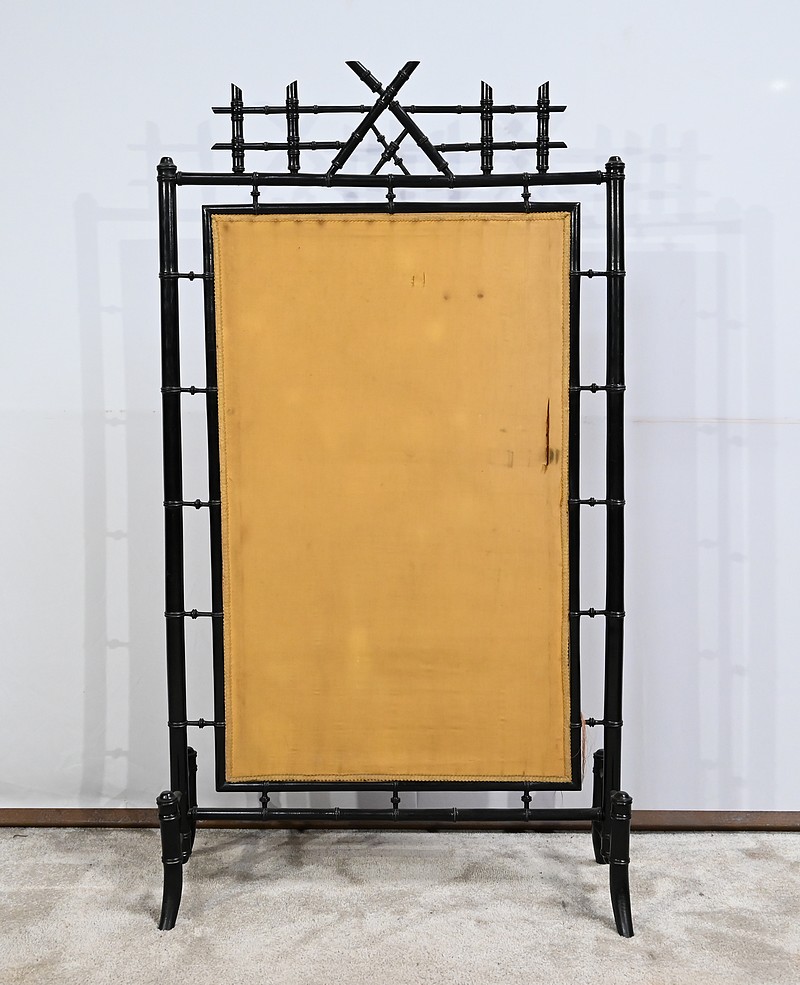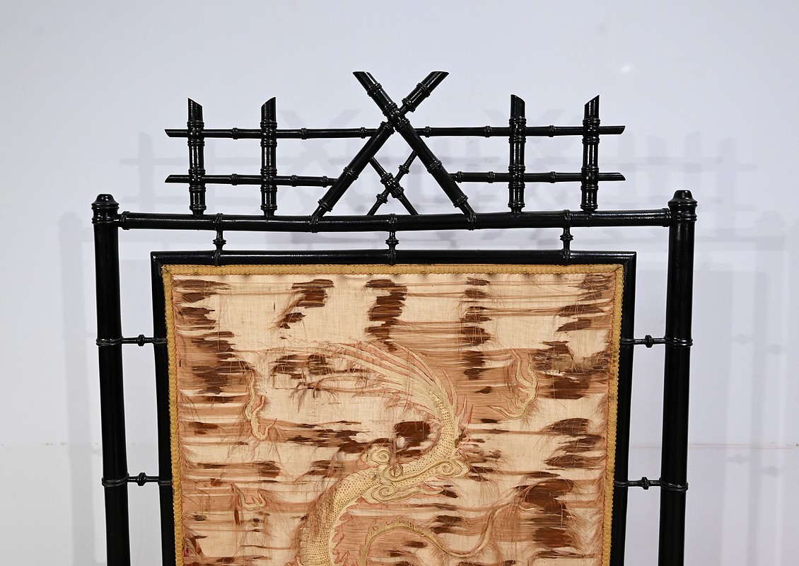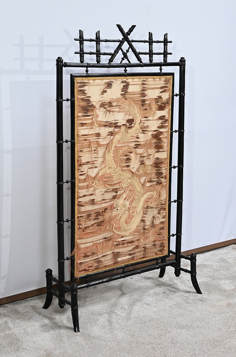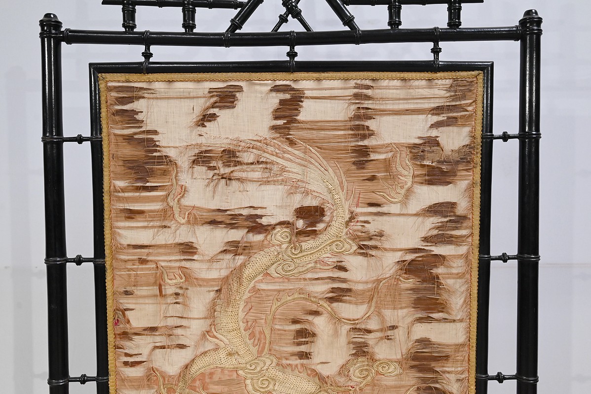 Écran de cheminée en bois noirci, façon bambou, garni d’un tissu de soierie à décor de dragon en relief.