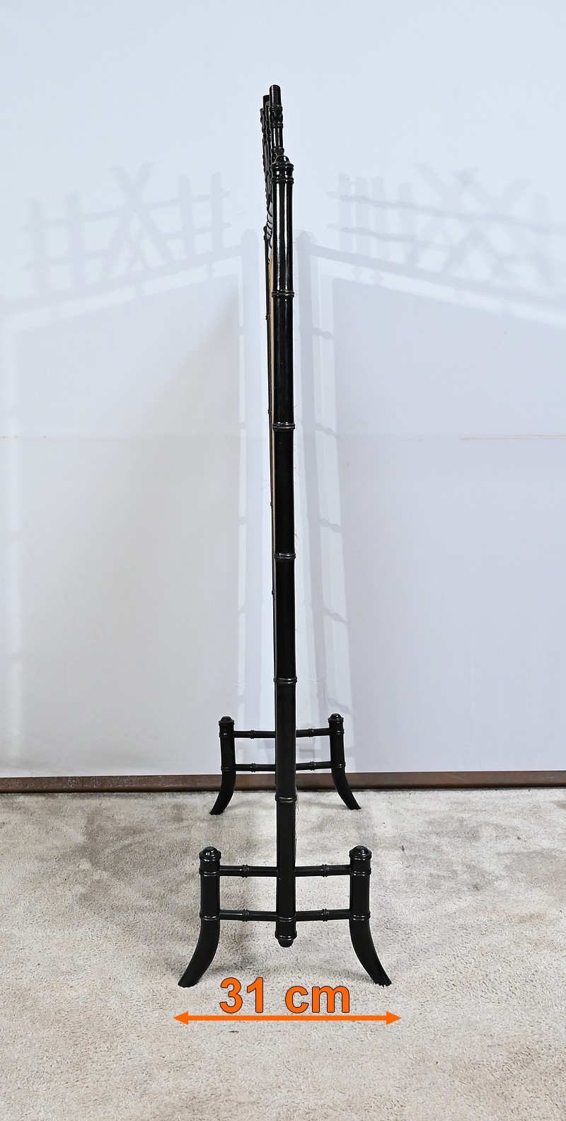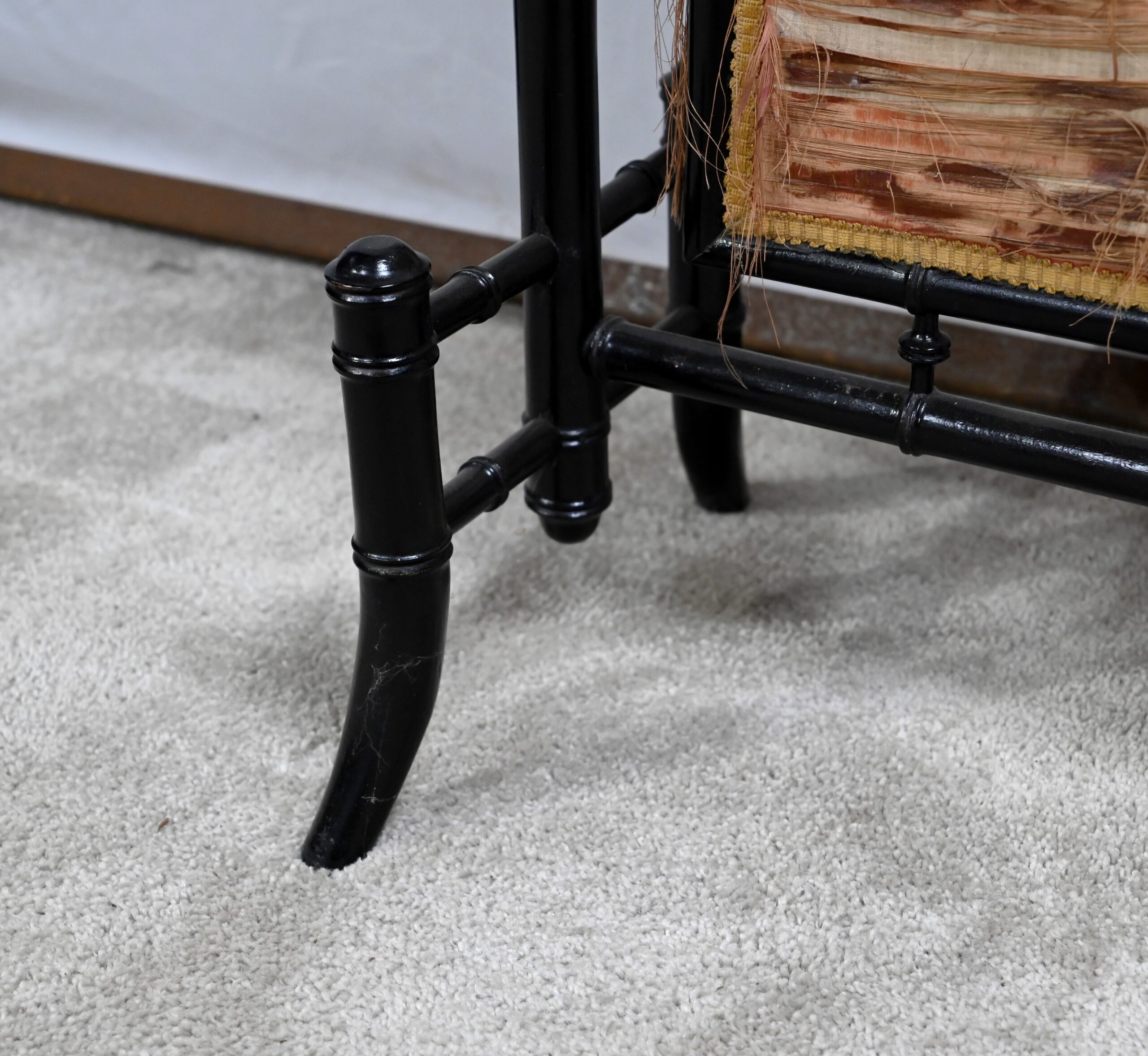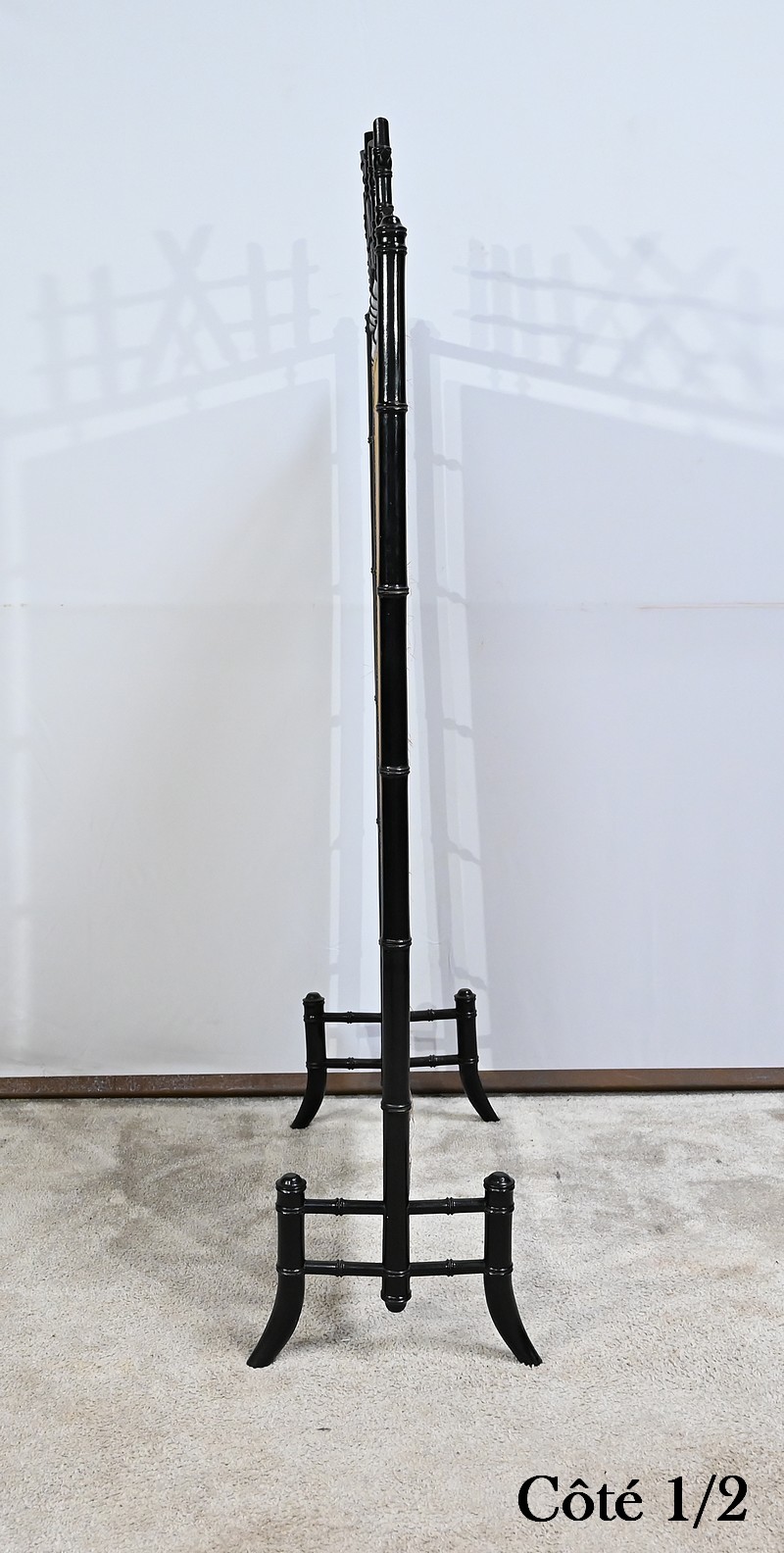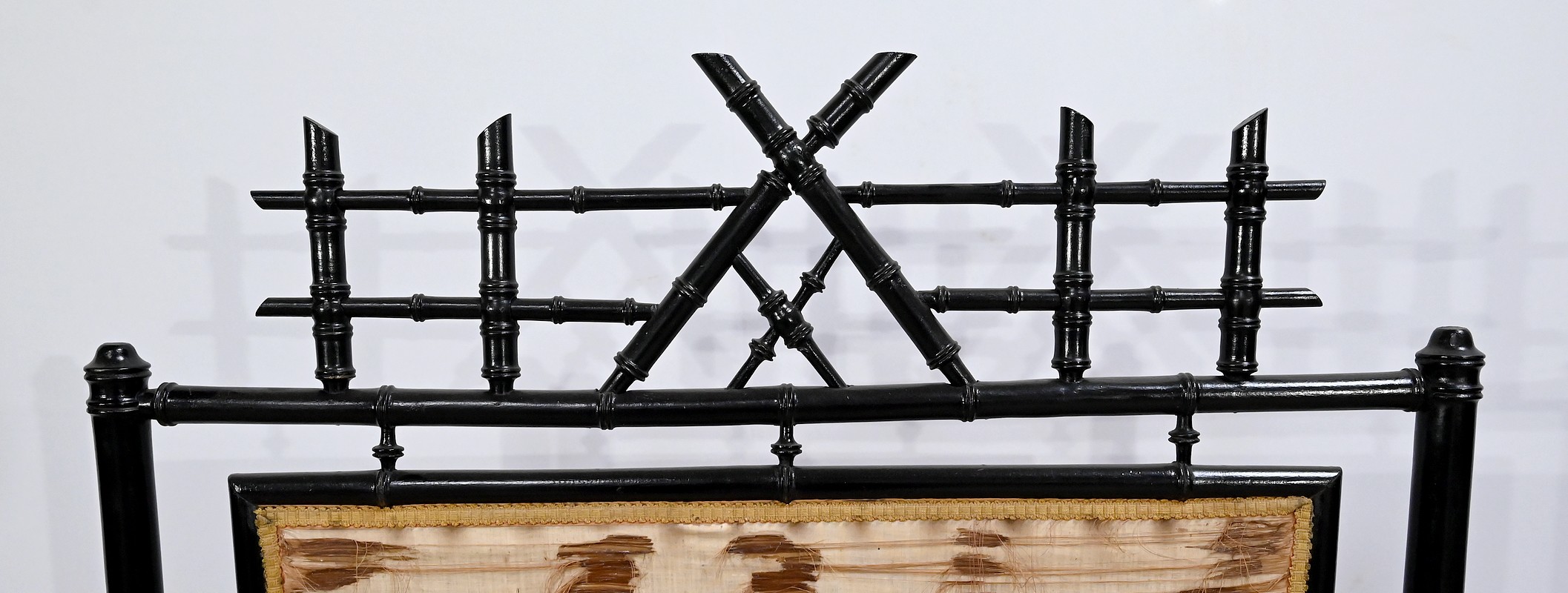 Écran de cheminée en bois noirci, façon bambou, garni d’un tissu de soierie à décor de dragon en relief.