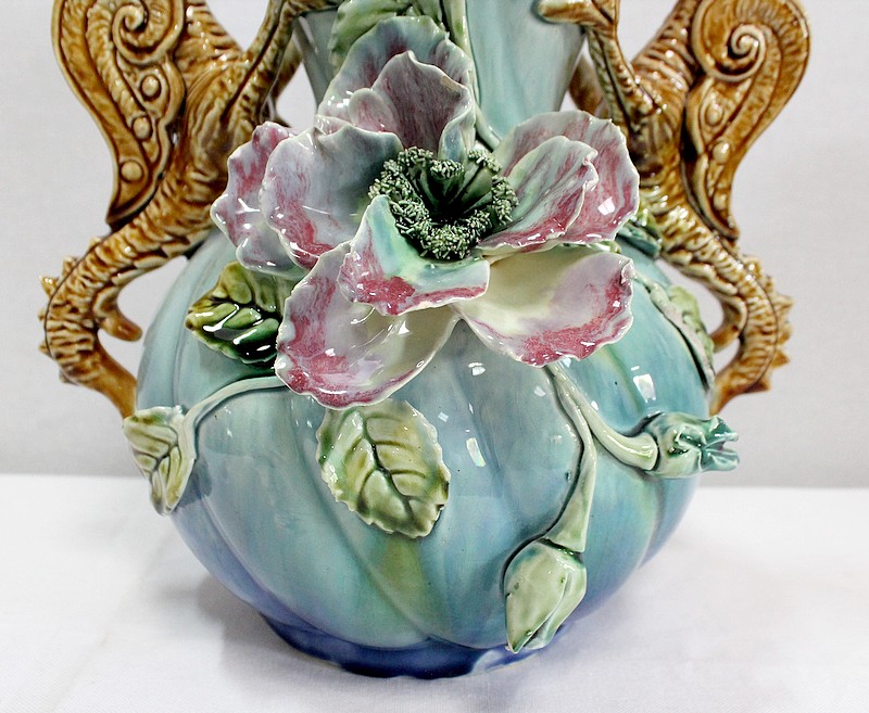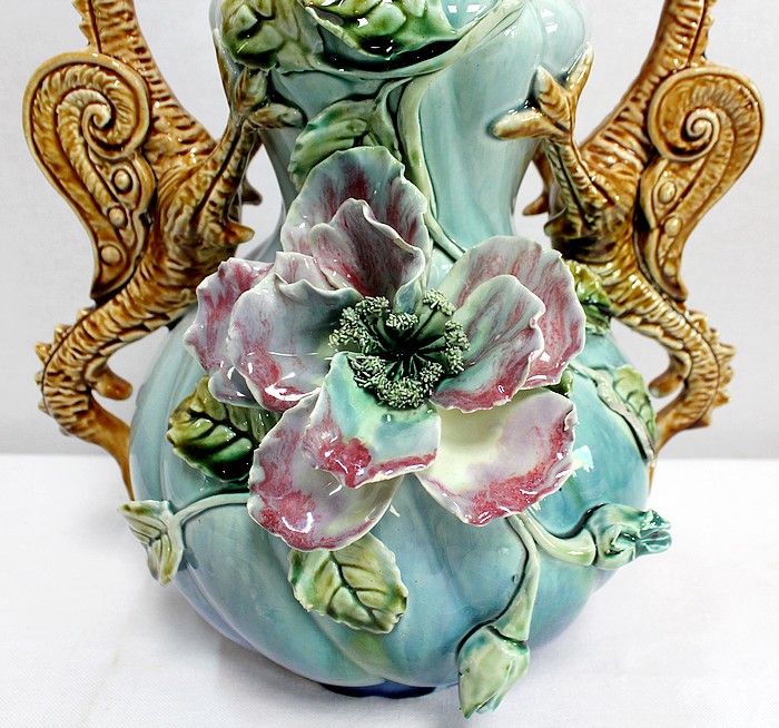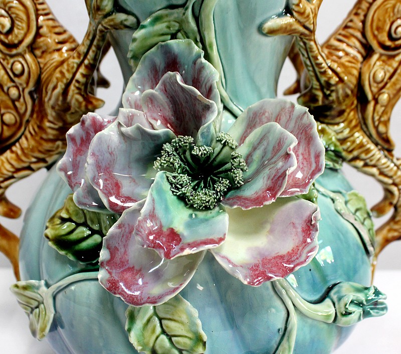 Les formes courbes et un dégradé de bleu et de vert, mettent en valeur les feuilles, les bourgeons et les fleurs dont les pétales sculptées finement ressortent en relief.