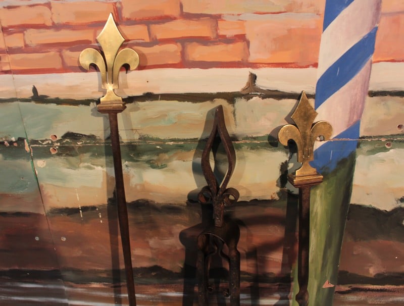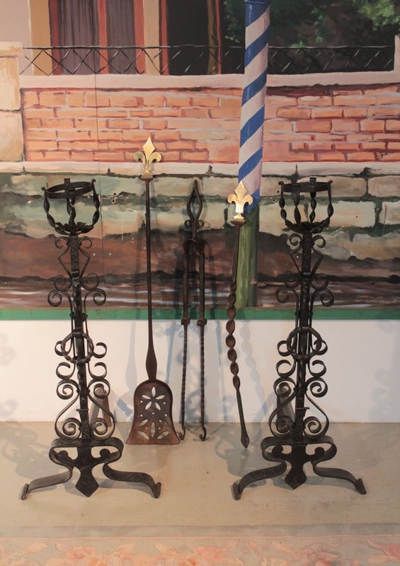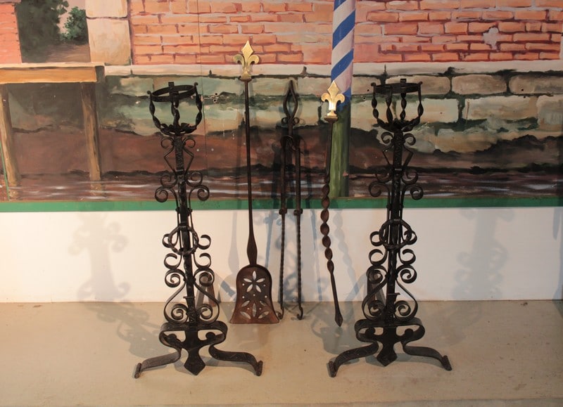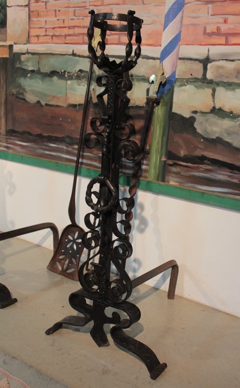 Paire de landiers en fer forgé avec les accessoires de cheminée.