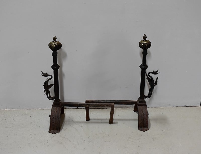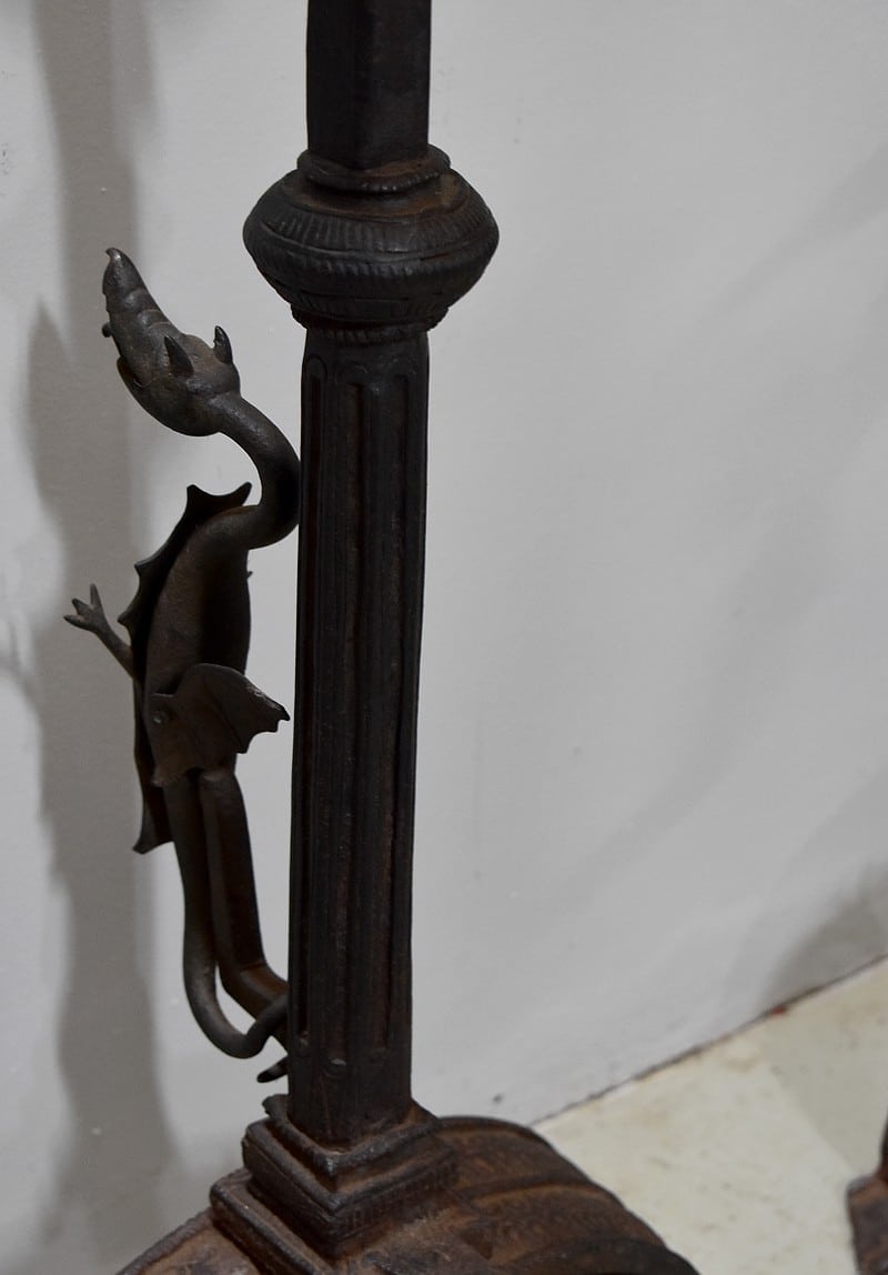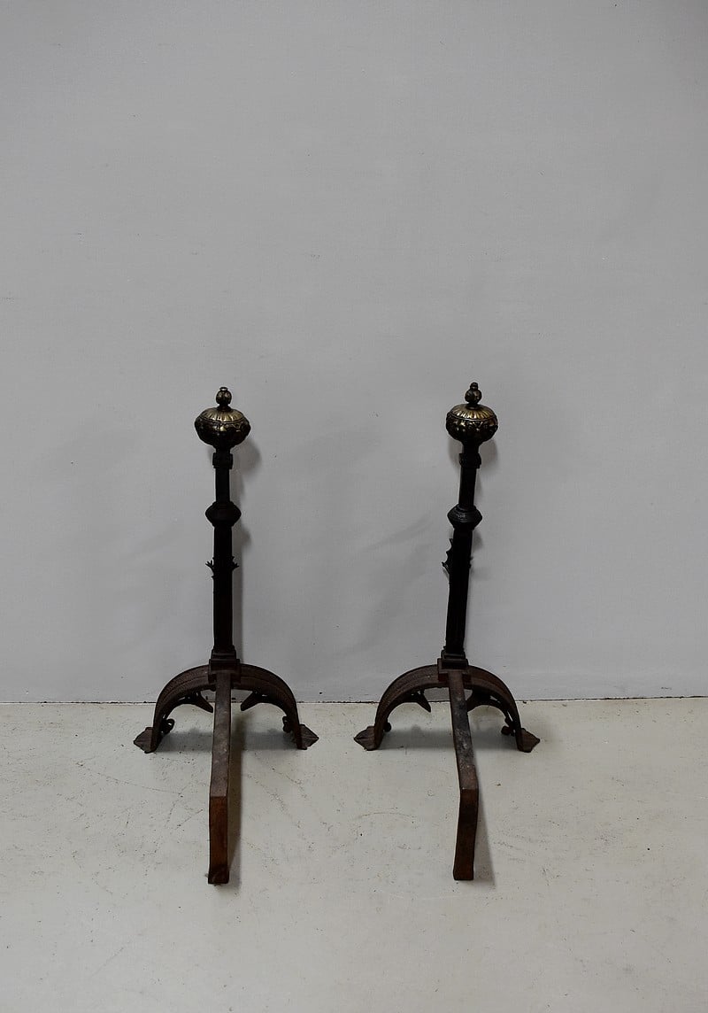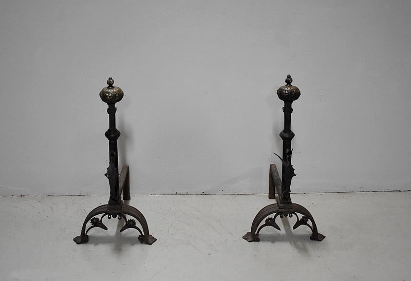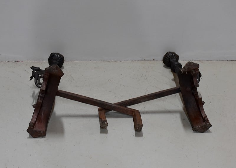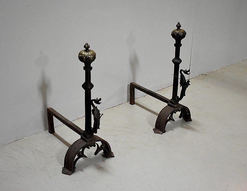 Paire de chenets de châteaux en Fonte et fer forgé.