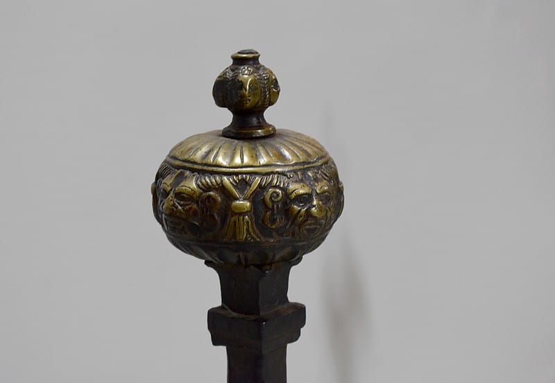 Ils sont ornés de petits dragons accrochés aux montants, lesquels sont surmontés d’une boule en bronze moulé à décors de masques de personnages.