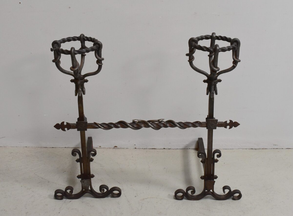 Paire de chenets en fer forgé torsadé, à décors de serpents, de style Renaissance.