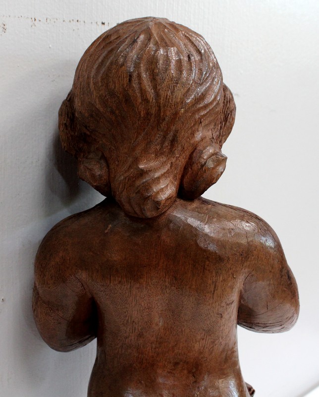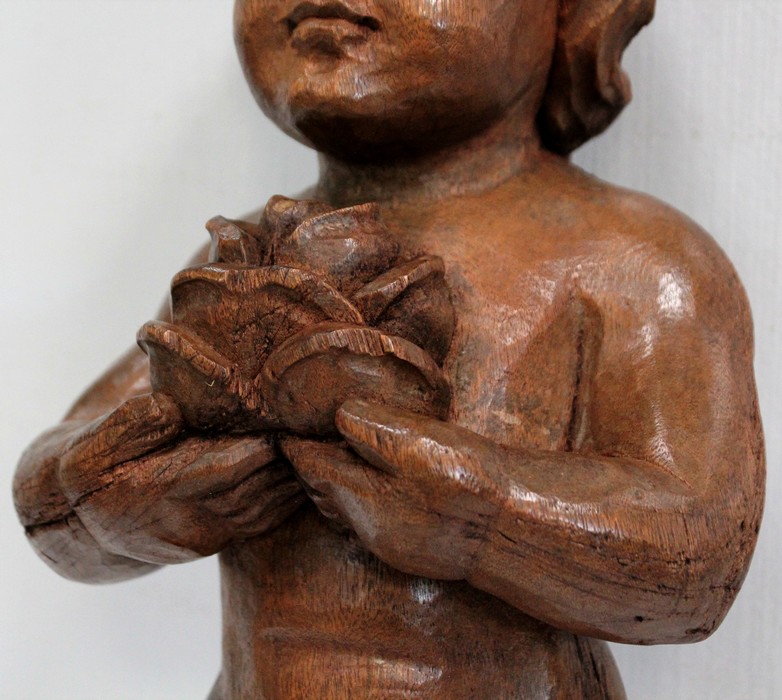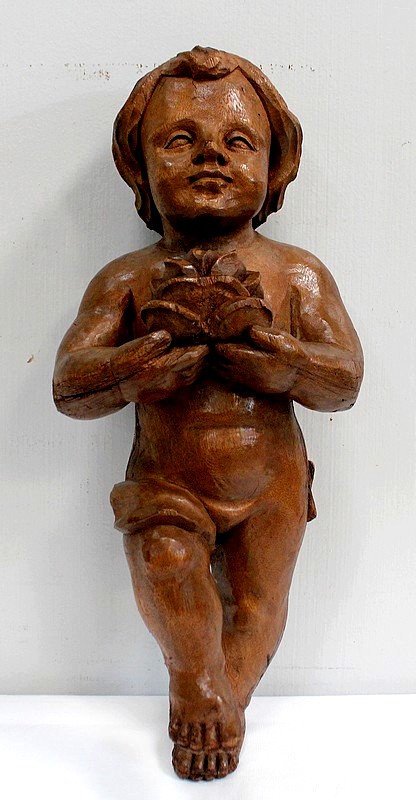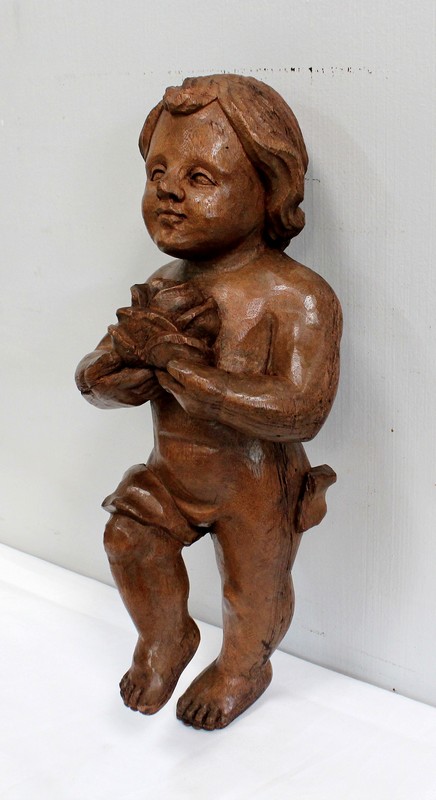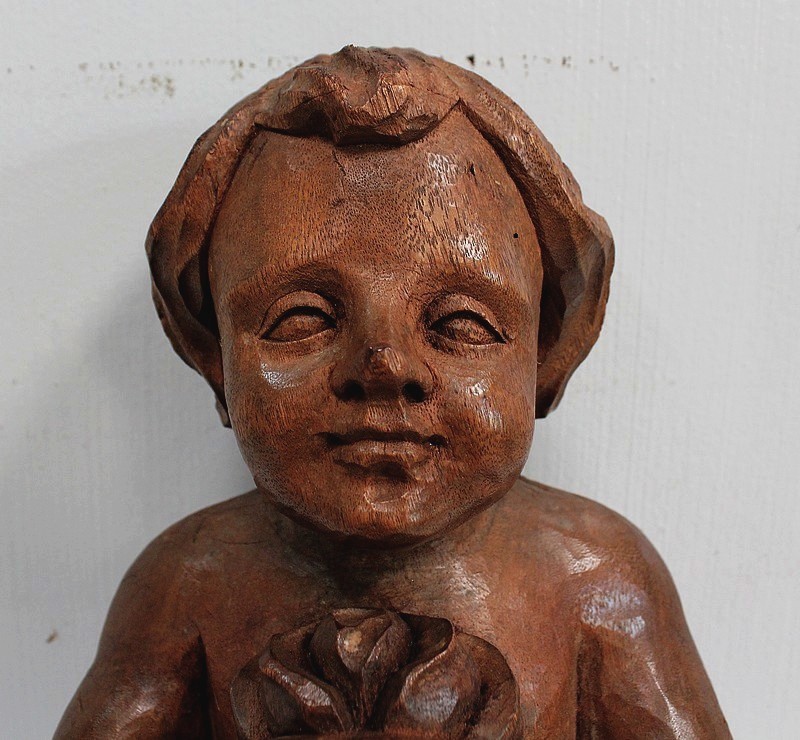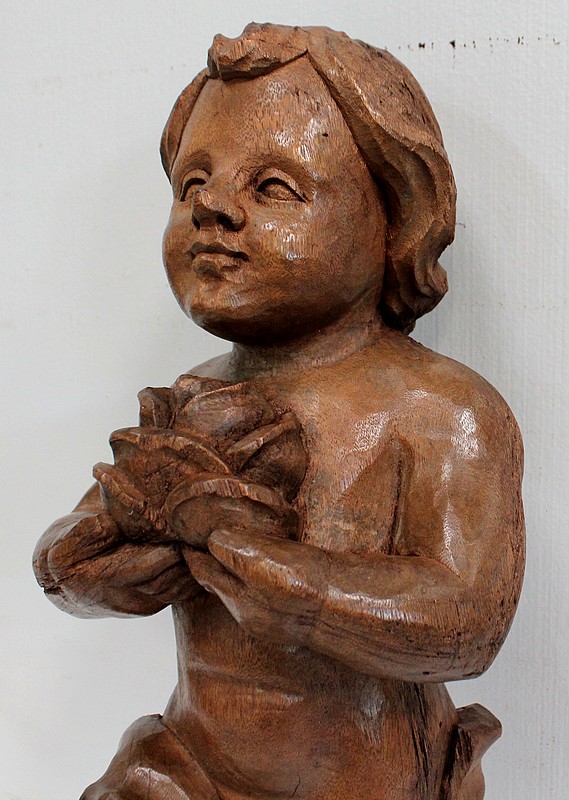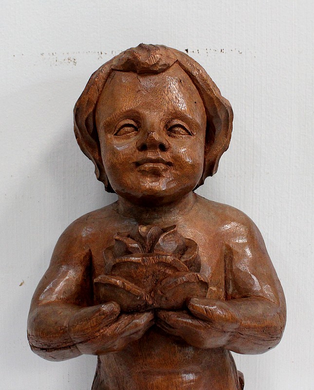 Mignon Chérubin en Bois Ciselé tenant une Rose et vêtu d’un Drapé.