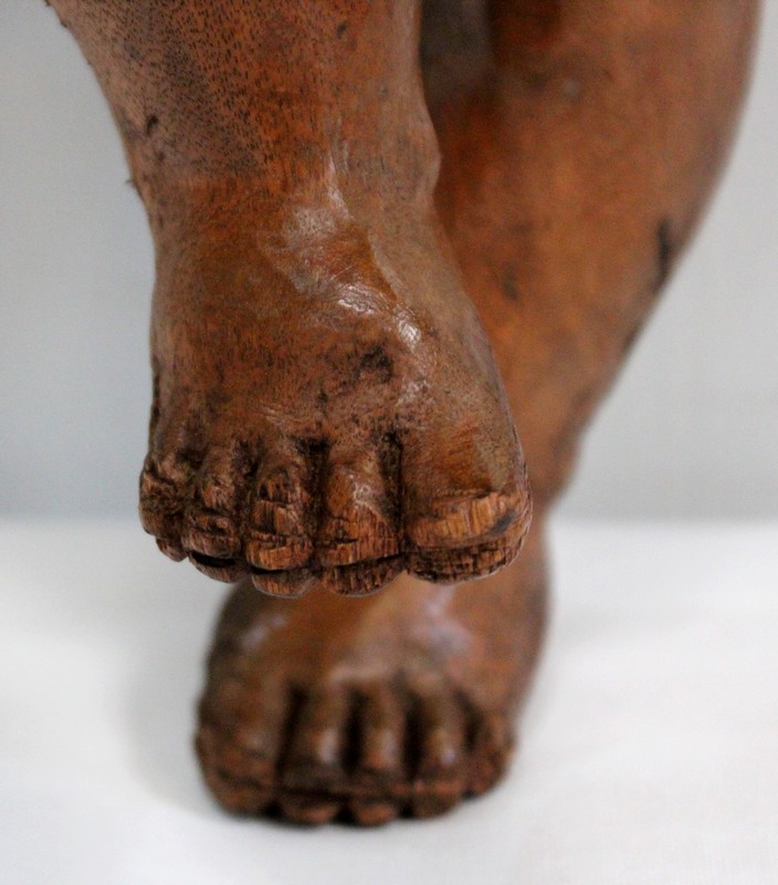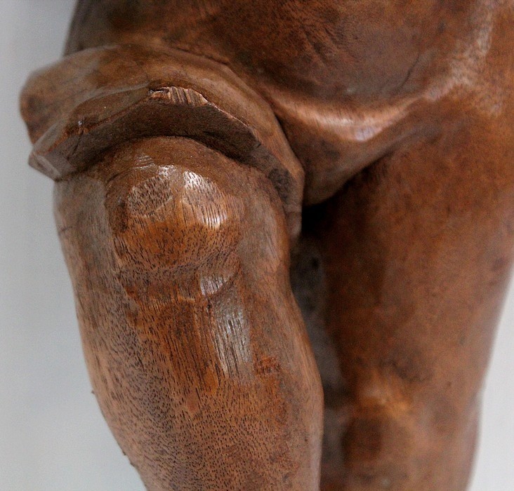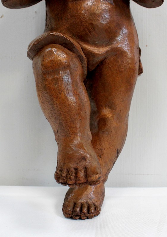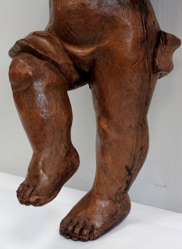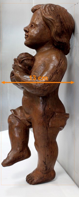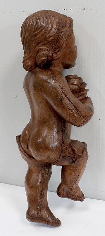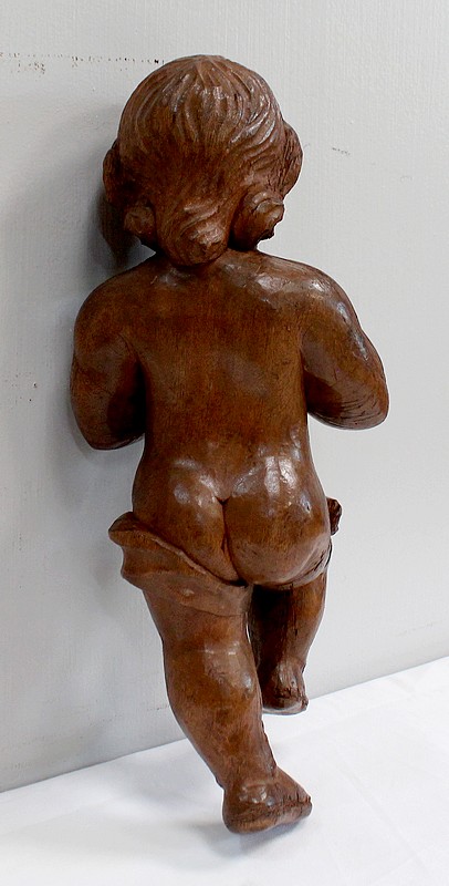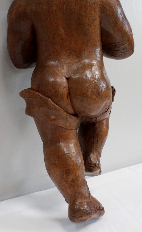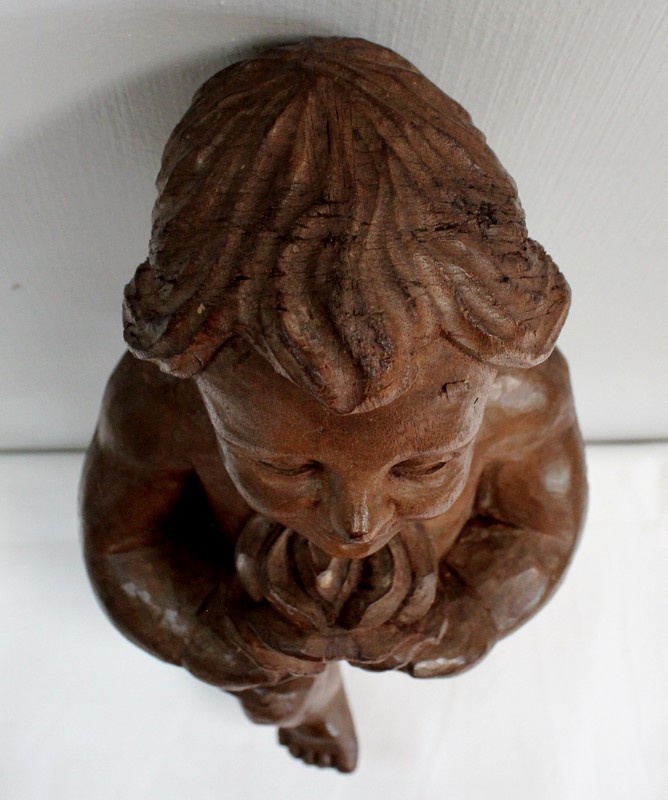 Mignon Chérubin en Bois Ciselé tenant une Rose et vêtu d’un Drapé.